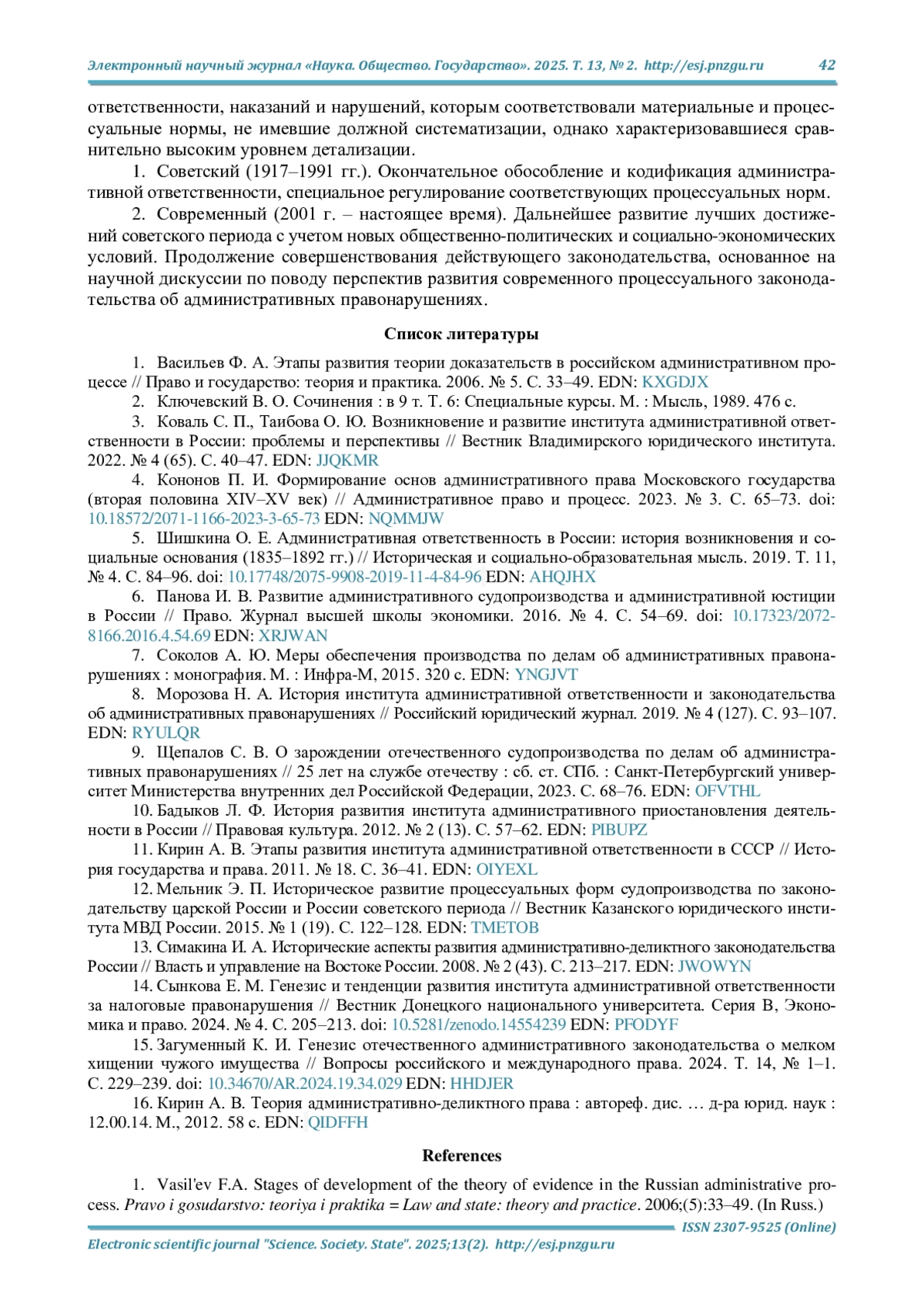 1. Васильев Ф. А. Этапы развития теории доказательств в российском административном процессе // Право и государство: теория и практика. 2006. № 5. С. 33-49. EDN: KXGDJX