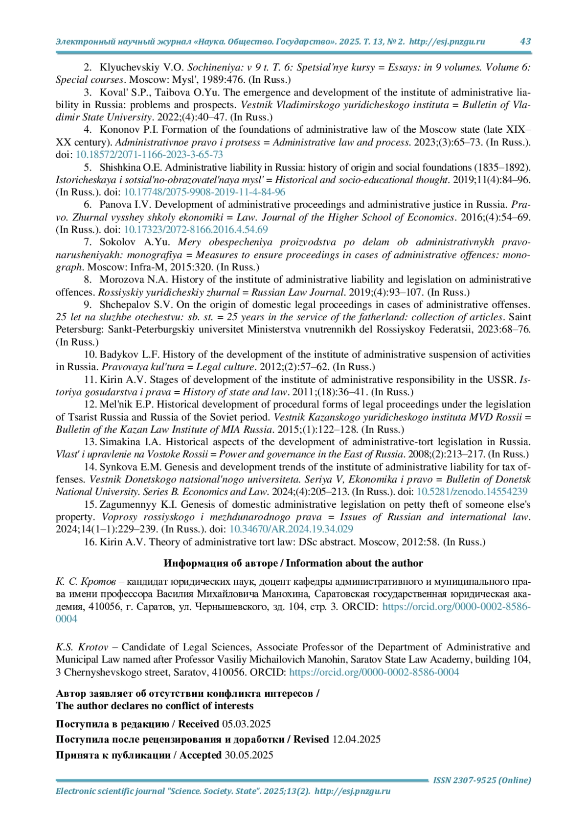 10. Бадыков Л. Ф. История развития института административного приостановления деятельности в России // Правовая культура. 2012. № 2 (13). С. 57-62. EDN: PIBUPZ