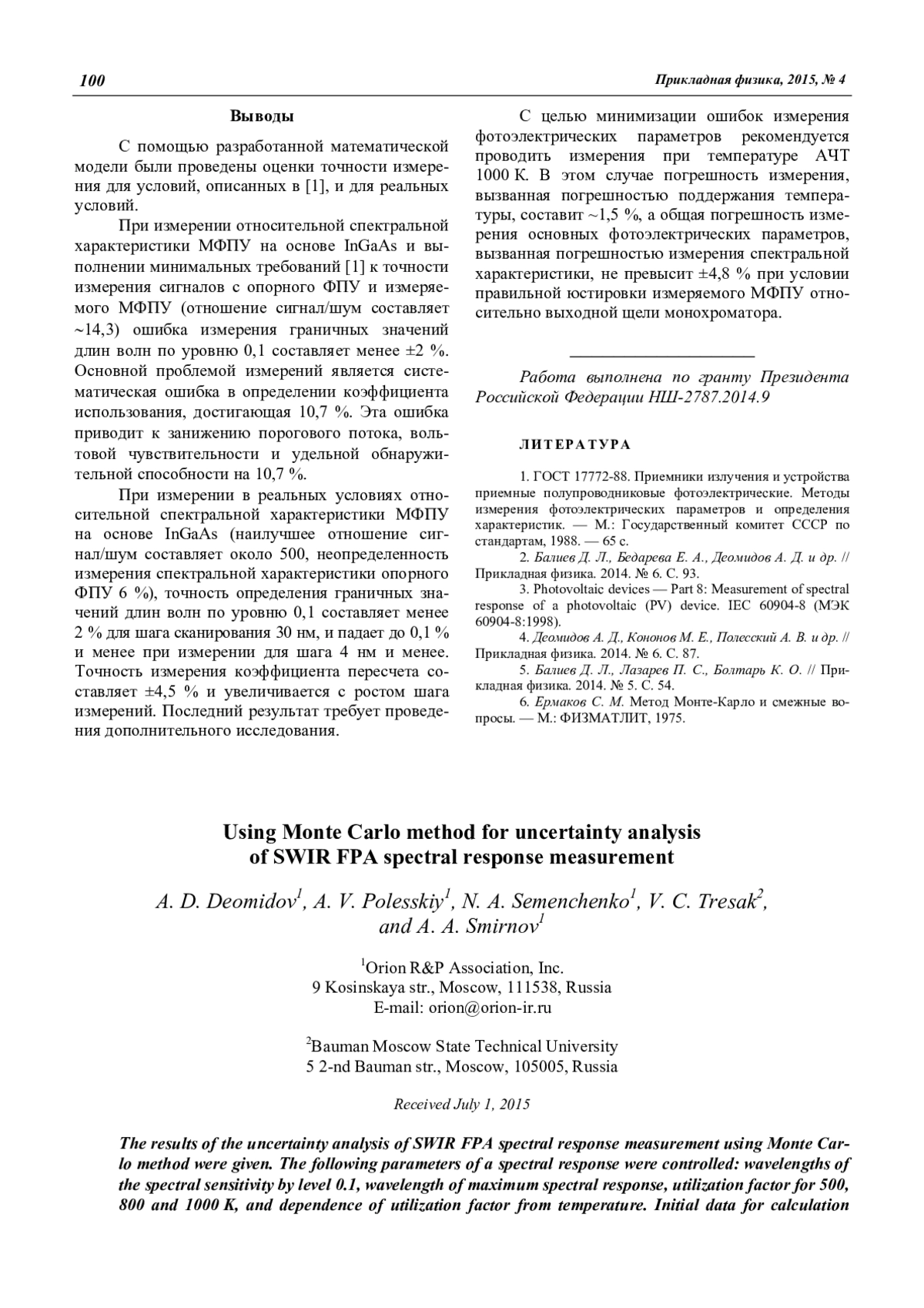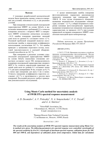 Деомидов А. Д., Полесский А. В., Семенченко Н. А., Тресак В. К., Смирнов А. А. Исследование точности измерения спектральной характеристики методом Монте-Карло матричных ИК фотоприемников диапазона 0,9-1,7 мкм 94