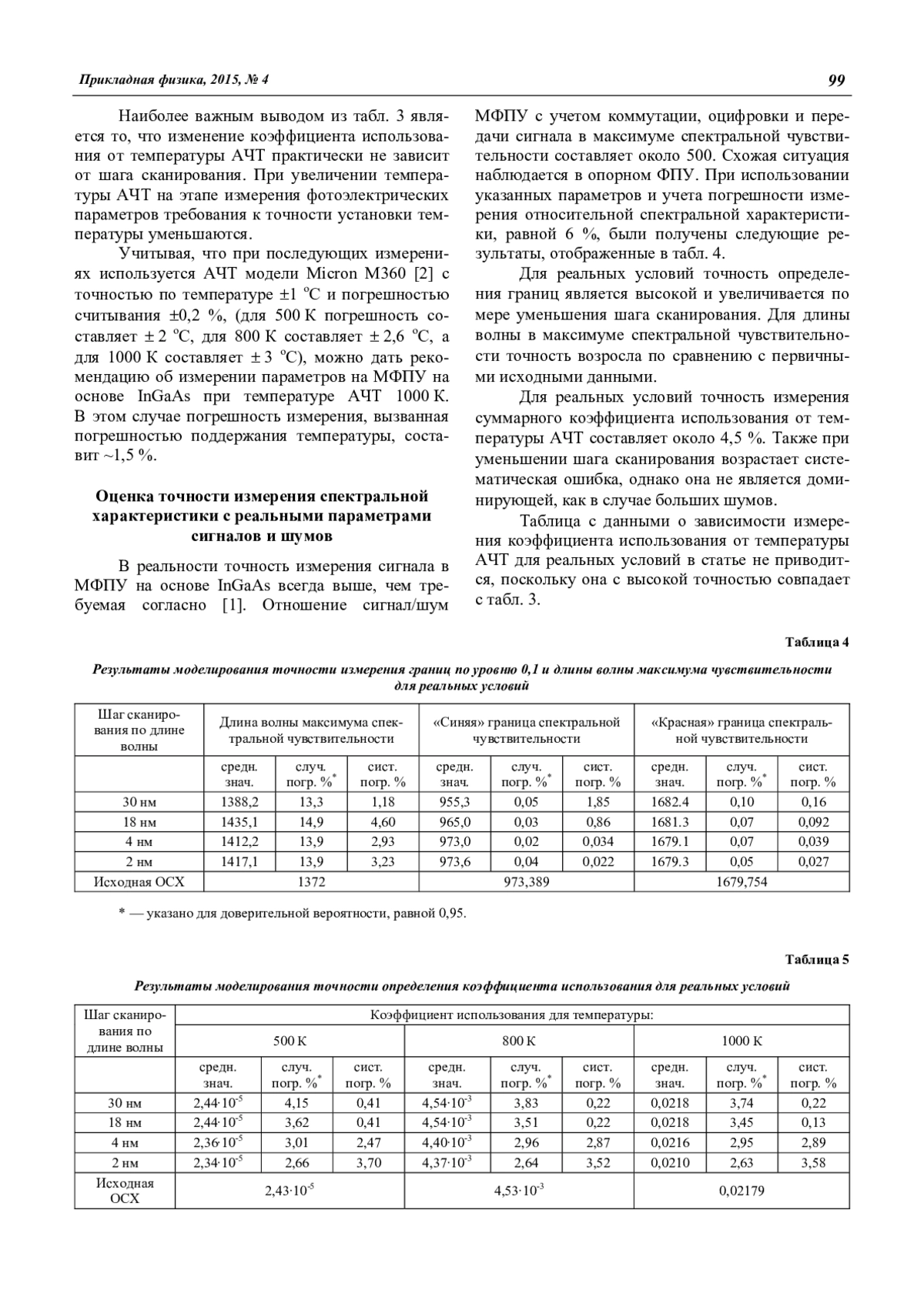 При измерении относительной спектральной характеристики МФПУ на основе InGaAs и выполнении минимальных требований [1] к точности измерения сигналов с опорного ФПУ и измеряемого МФПУ (отношение сигнал/шум составляет 14,3) ошибка измерения граничных значений длин волн по уровню 0,1 составляет менее ±2 %. Основной проблемой измерений является систематическая ошибка в определении коэффициента использования, достигающая 10,7 %. Эта ошибка приводит к занижению порогового потока, вольтовой чувствительности и удельной обнаружительной способности на 10,7 %.