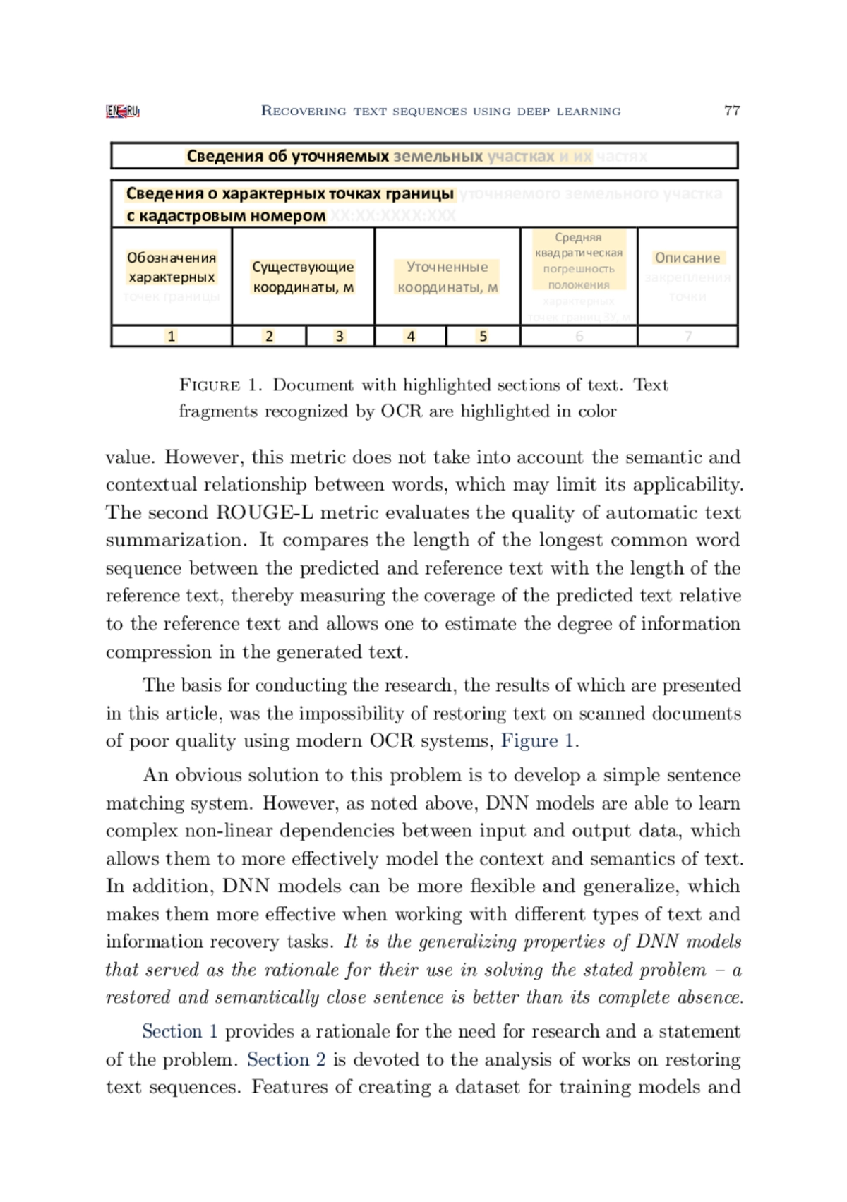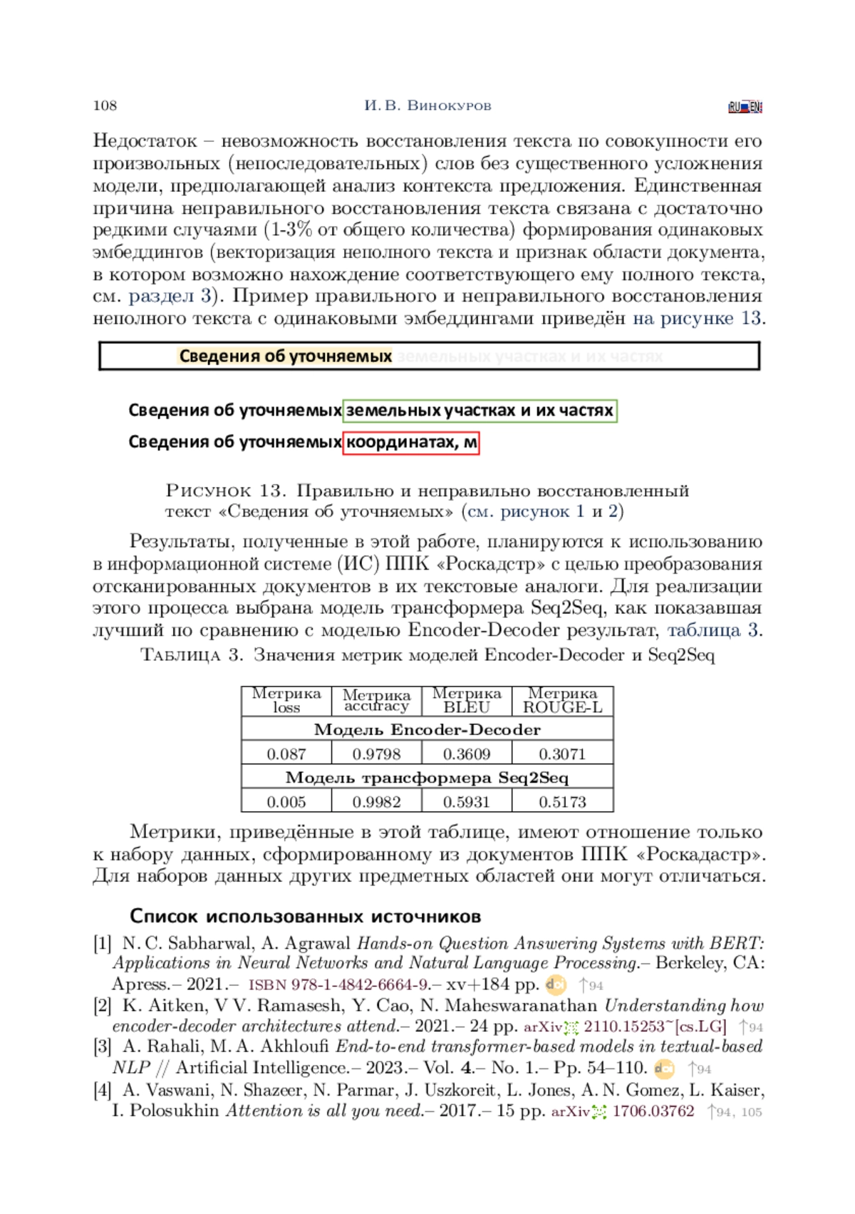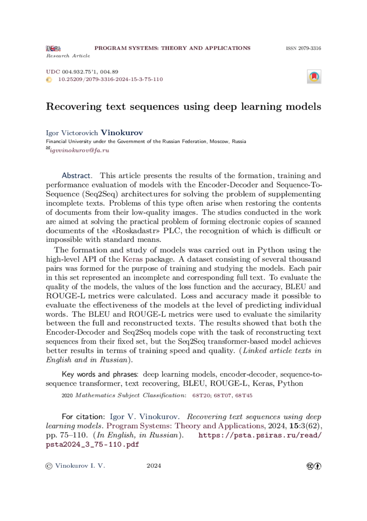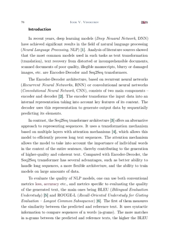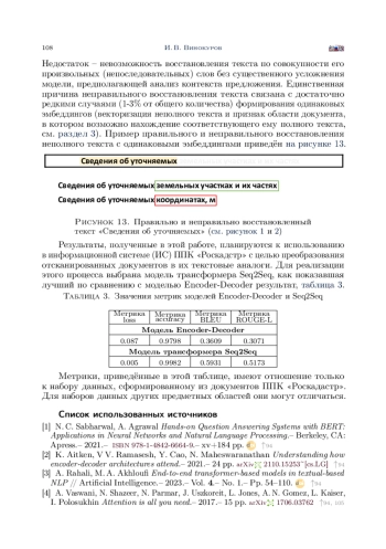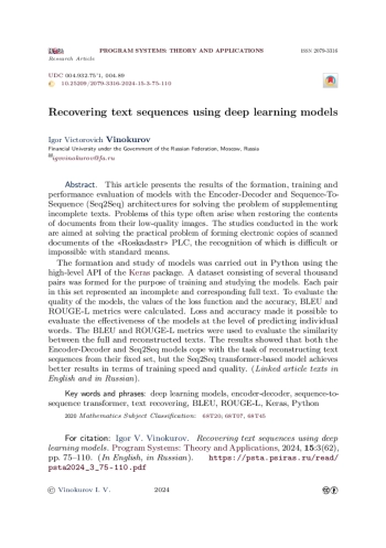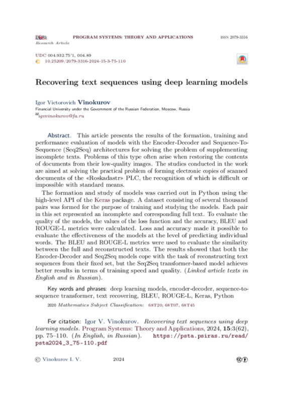 В статье приведены результаты формирования, обучения и оценки качества работы моделей с архитектурами Encoder-Decoder и Sequence-To-Sequence (Seq2Seq) для решения задачи дополнения неполных текстов. Задачи такого типа достаточно часто возникают при восстановлении содержимого документов по их некачественным изображениям. Проведённые в работе исследования ориентированы на решение практической задачи формирования электронных копий отсканированных документов ППК «Роскадастр», распознавание которых стандартными средствами затруднительно или невозможно. Формирование и исследование моделей осуществлялось на языке Python с использованием высокоуровневого API пакета Keras. С целью обучения и исследования моделей был сформирован набор данных, состоящий из нескольких тысяч пар. Каждая пара этого набора представляла собой неполный и соответствующий ему полный тексты. Для оценки качества работы моделей осуществлялось вычисление значений функции потерь loss и метрик accuracy, BLEU и ROUGE-L. Loss и accuracy позволили оценить эффективность моделей на уровне предсказания отдельных слов. Метрики BLEU и ROUGE-L использовались для оценки сходства между полными и восстановленными текстами. Полученные результаты показали, что обе модели Encoder-Decoder и Seq2Seq справляются с задачей восстановления текстовых последовательностей из их фиксированного множества, однако модель на основе трансформера Seq2Seq позволяет достичь лучших результатов по скорости и качеству обучения.