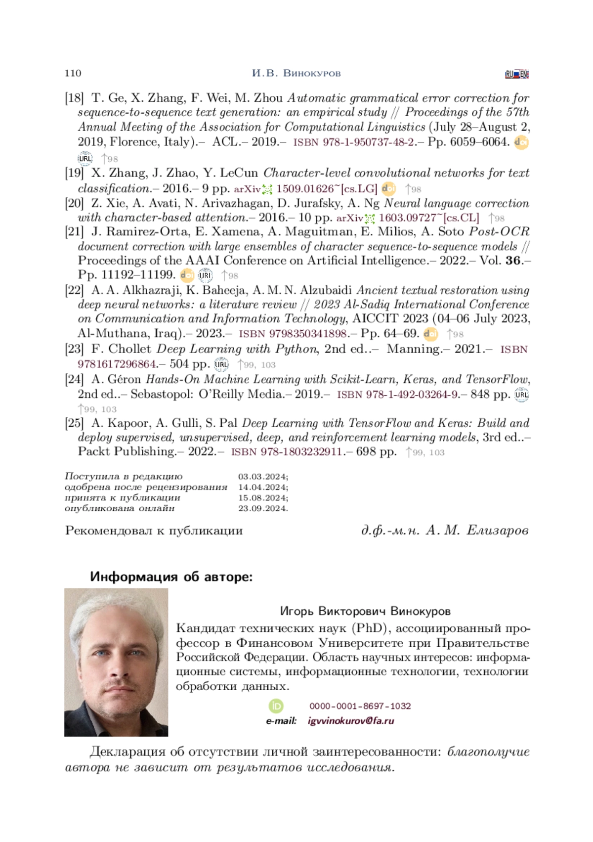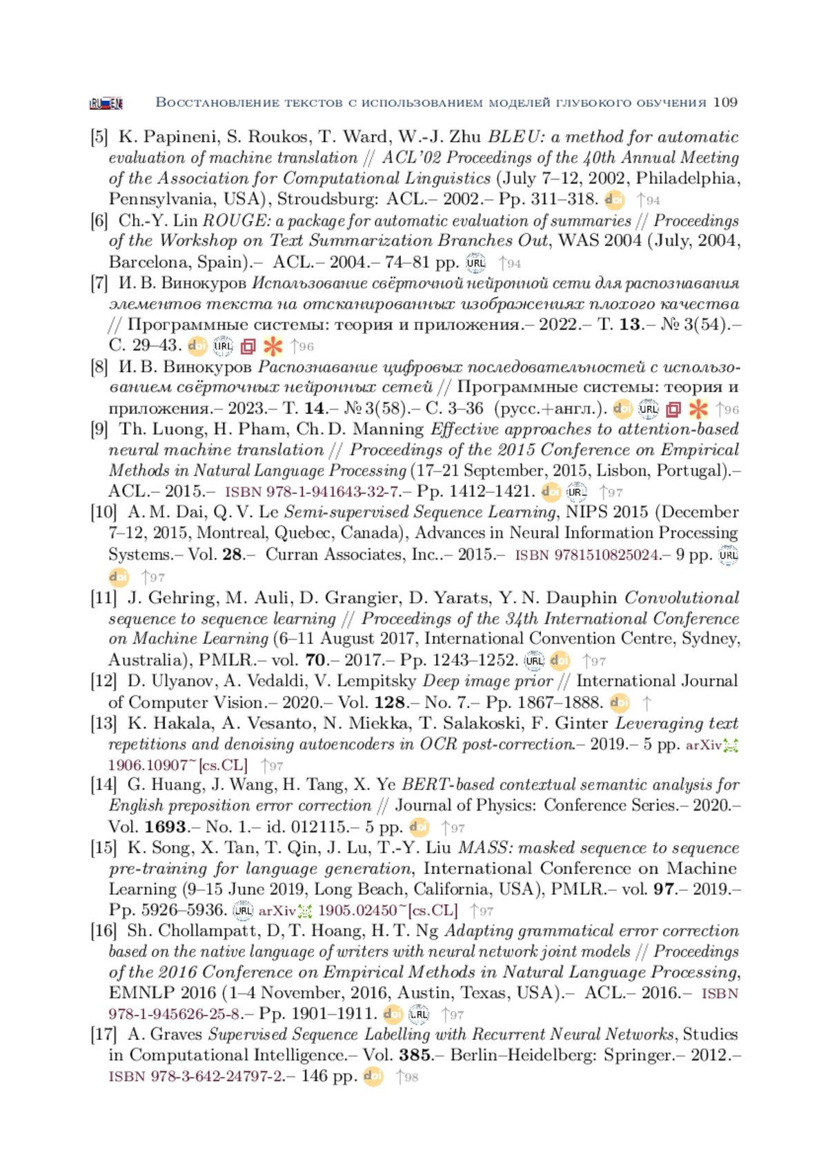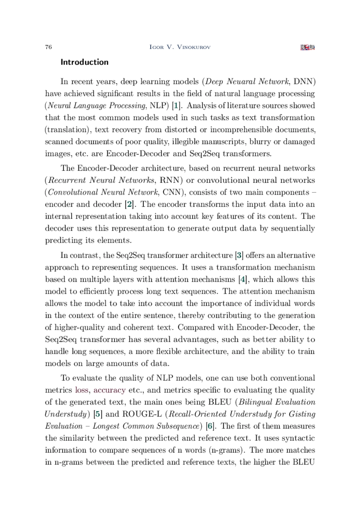 В статье приведены результаты формирования, обучения и оценки качества работы моделей с архитектурами Encoder-Decoder и Sequence-To-Sequence (Seq2Seq) для решения задачи дополнения неполных текстов. Задачи такого типа достаточно часто возникают при восстановлении содержимого документов по их некачественным изображениям. Проведённые в работе исследования ориентированы на решение практической задачи формирования электронных копий отсканированных документов ППК «Роскадастр», распознавание которых стандартными средствами затруднительно или невозможно. Формирование и исследование моделей осуществлялось на языке Python с использованием высокоуровневого API пакета Keras. С целью обучения и исследования моделей был сформирован набор данных, состоящий из нескольких тысяч пар. Каждая пара этого набора представляла собой неполный и соответствующий ему полный тексты. Для оценки качества работы моделей осуществлялось вычисление значений функции потерь loss и метрик accuracy, BLEU и ROUGE-L. Loss и accuracy позволили оценить эффективность моделей на уровне предсказания отдельных слов. Метрики BLEU и ROUGE-L использовались для оценки сходства между полными и восстановленными текстами. Полученные результаты показали, что обе модели Encoder-Decoder и Seq2Seq справляются с задачей восстановления текстовых последовательностей из их фиксированного множества, однако модель на основе трансформера Seq2Seq позволяет достичь лучших результатов по скорости и качеству обучения.