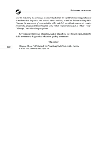 Современное общество и окружающая его действительность динамично развивают ся, что затрагивает и технологии, интегрируемые практически во все сферы жизнедеятельности человека. Обозначенные тенденции ведут к тому, что содержательный компонент используемой и приобретаемой суммы знаний постоянно и стремительно меняется. Этим вызвана необходимость использовать актуальные средства оцен ки навыков обучающихся, которые будут отвечать требованиям социального заказа. Новизна исследования обусловлена отсутствием работ по сравнительному анализу диагностического инструментария, ориентированного на контроль результатов обучения китайских и российских студентов, используемого в обеих странах. Цель рабо ты — определить опыт использования и интеграции в систему высшего образования данных государств кейстехнологий, осуществляющих проверку навыков студентов. Показано, что оценка навыков слушателей вузов с использованием комплексных интерактивных технологий и других материалов становится мейстримоминновационного развития средств контроля и самоконтроля. При этом необходимо определять уровень развития не только навыков мышления, рабочей памяти и индукции, но также и таких паттернов мыслительной деятельности и поведения студентов, как способность рабо тать с информационными компьютерными технологиями. Сделан вывод о том, что в настоящий момент компьютерные кейсметоды, используемые в оценке знаний обучающихся высших учебных заведений, способны диагностировать уровень владения мате матическими, речевыми, естественнонаучными дисциплинами и навыками принятия решений, однако остается проблематичной проверка коммуникативных навыков и их деятельностного компонента, что целесообразно решать посредством использования таких виртуальных голосовых помощников, как «Алиса», Siri, «Маруся», и других диалоговых систем