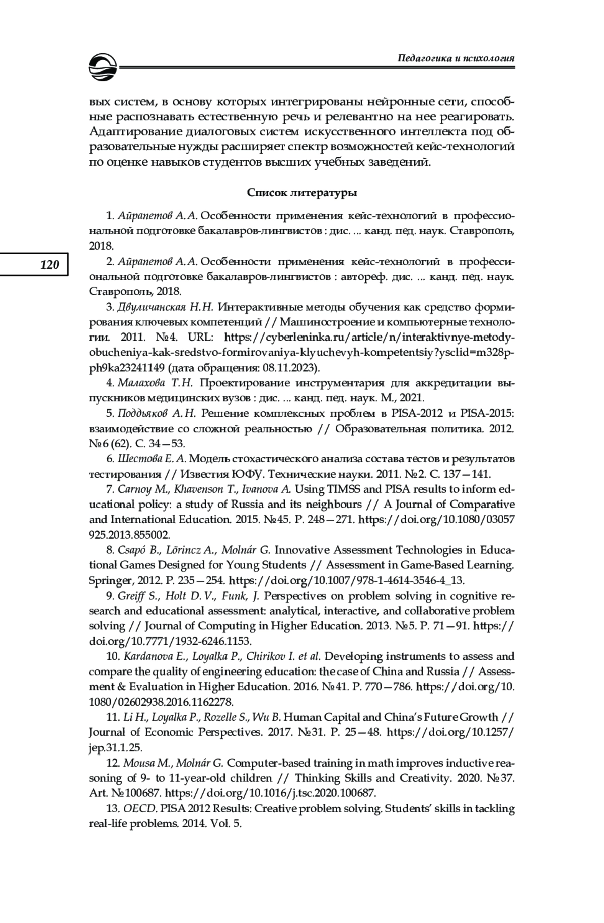 1. Айрапетов А. А. Особенности применения кейс-технологий в профессиональной подготовке бакалавров-лингвистов: дис.. канд. пед. наук. Ставрополь, 2018. EDN: WQRTYI