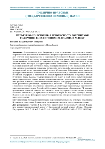 Актуальность и цели. Актуальность темы исследования определяется ее научно-теоретической и практической значимостью. В научно-теоретическом плане ее изучение позволяет углубить наши представления о национальной безопасности России как системной проблеме, включающей внутренние и внешние угрозы. В практическом плане тема значима с точки зрения выработки рекомендаций по совершенствованию российского законодательства с учетом введения в него института культурно-нравственной безопасности.