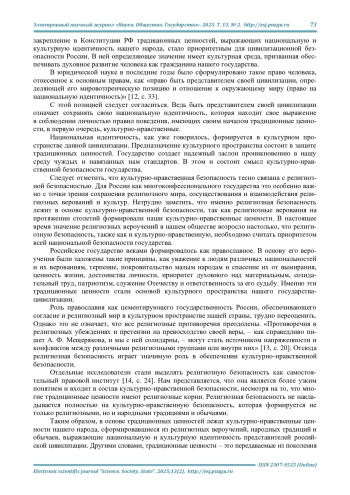 Выводы. Традиционные ценности имеют в своей основе культурно-нравст- венные представления нашего народа, сформировавшиеся из религиозных вероучений, народных традиций и обычаев, выражающие национальную и культурную идентичность представителей российской цивилизации. Традиционные ценности - это передаваемые из поколения в поколение культурно-нравственные ориентиры, формирующие национальную идентичность многонационального народа Российской Федерации. Закрепление в Конституции РФ духовно-нравственных ценностей означает, что именно их наше государство считает самыми важными и самыми значимыми для гражданского общества и берет их под свою правовую защиту. Именно на их основе формируется культурно-нравственная или цивилизационная безопасность нашего государства.