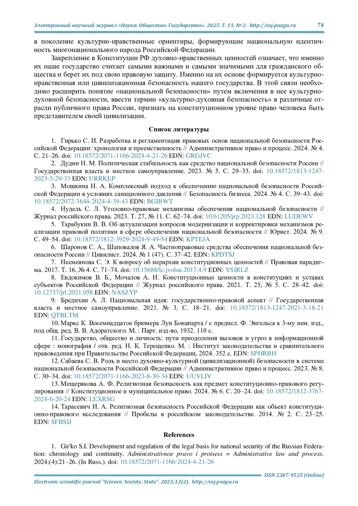 1. Гирько С. И. Разработка и регламентация правовых основ национальной безопасности Российской Федерации: хронология и преемственность // Административное право и процесс. 2024. № 4. С. 21-26. DOI: 10.18572/2071-1166-2024-4-21-26 EDN: GRGJVC