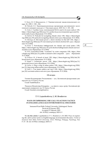 10. Павлова Е. Б. Лингвопрагматическая организация англоязычного экологического интернет-дискурса // Научный диалог. 2019. № 1. С. 88-100. EDN: YVRCCL