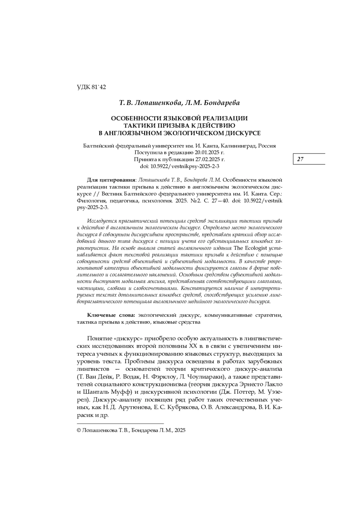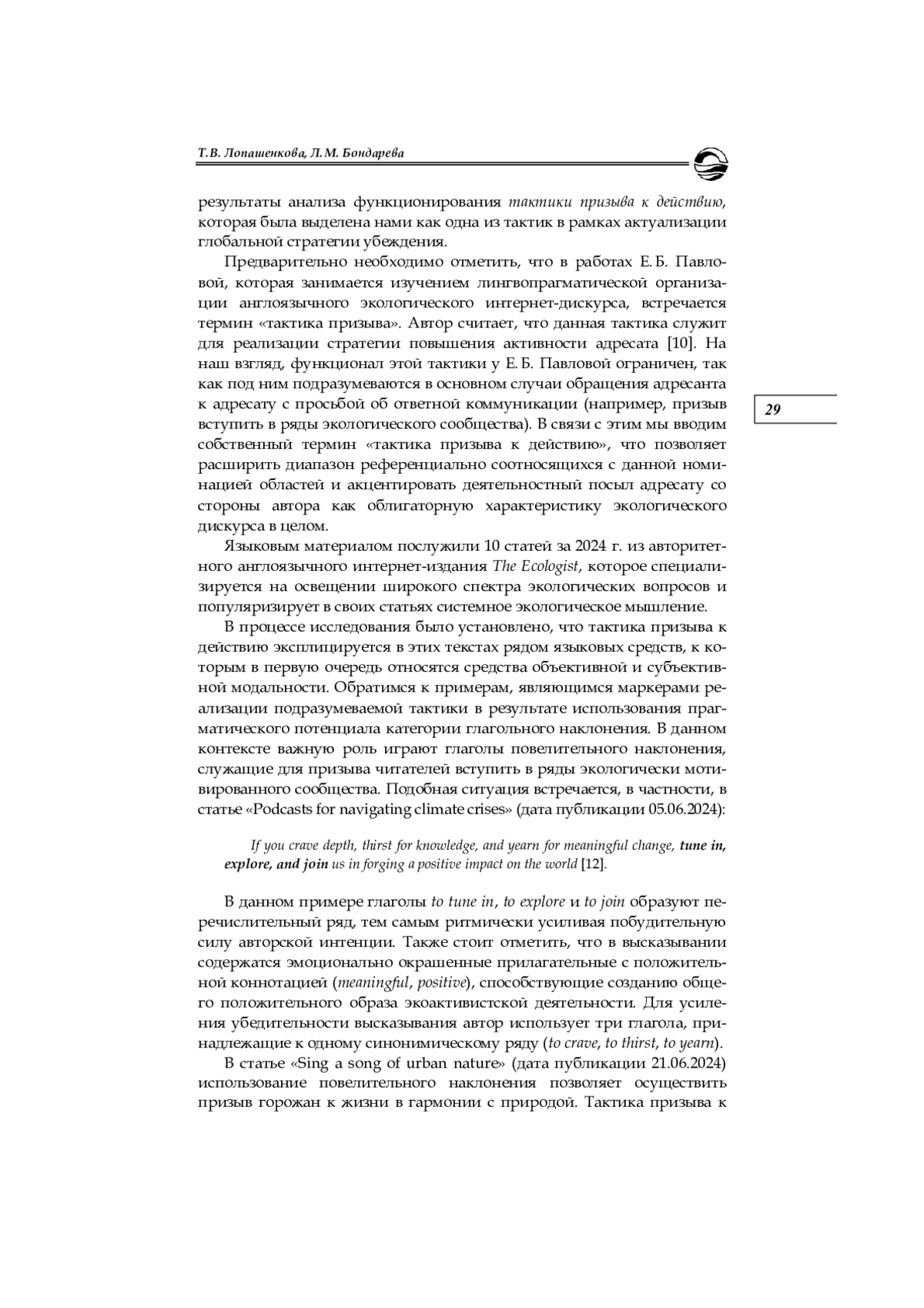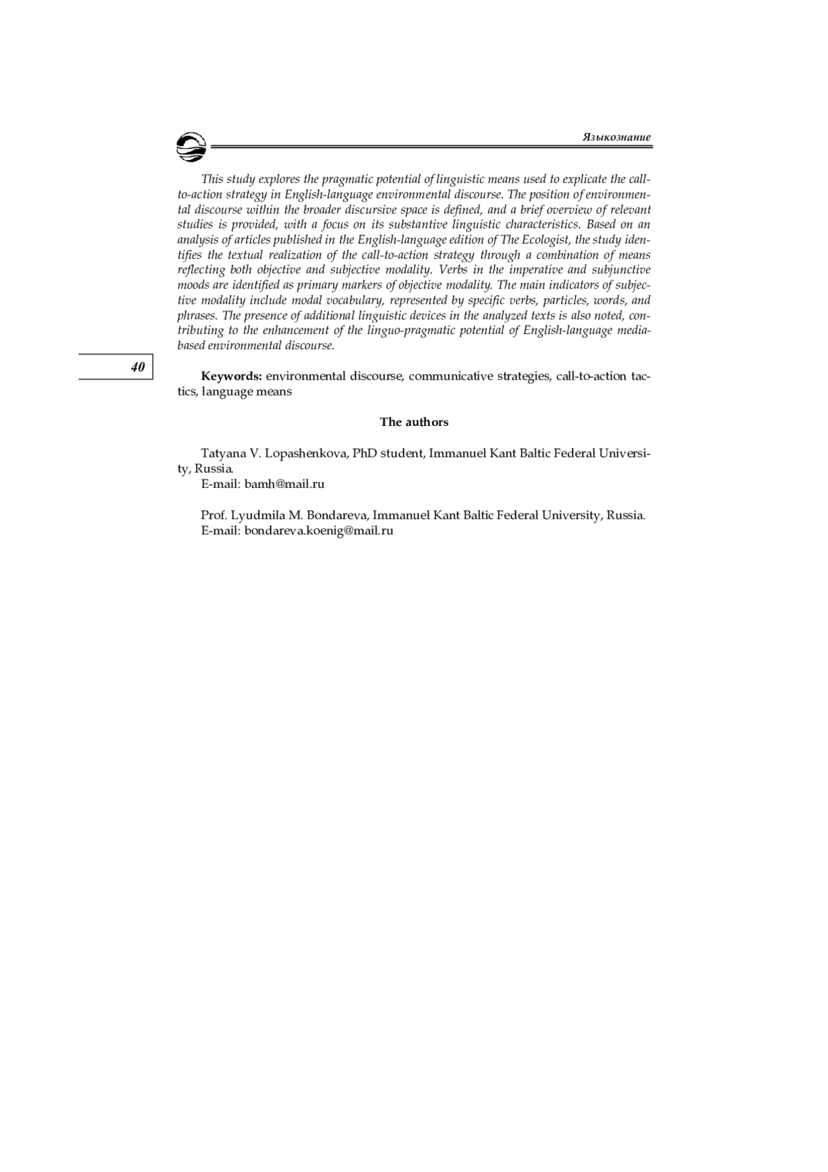 Исследуется прагматический потенциал средств экспликации тактики призыва к действию в англоязычном экологическом дискурсе. Определено место экологического дискурса в совокупном дискурсивном пространстве, представлен краткий обзор исследований данного типа дискурса с позиции учета его субстанциальных языковых характеристик. На основе анализа статей англоязычного издания The Ecologist устанавливается факт текстовой реализации тактики призыва к действию с помощью совокупности средств объективной и субъективной модальности. В качестве репрезентантов категории объективной модальности фиксируются глаголы в форме повелительного и сослагательного наклонений. Основным средством субъективной модальности выступает модальная лексика, представленная соответствующими глаголами, частицами, словами и словосочетаниями. Констатируется наличие в интерпретируемых текстах дополнительных языковых средств, способствующих усилению лингвопрагматического потенциала англоязычного медийного экологического дискурса