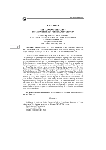 В статье раскрывается символизм топоса леса в романе Н. Готорна «Алая буква». Цель исследования состоит в том, чтобы не только истолковать значения этого топоса, но и показать его роль в построении трех внутренних сюжетов романа. Краткий обзор истории рецепции леса как символического пространства в европейской культуре позволил выделить четыре основных значения данного топоса: лес как материя и ресурс, лес как ад, лес как рай, лес как пограничье (пространство инициации героя). Предлагаемое прочтение романа «Алая буква» с позиций культурно-исторической и мифологической школ показало, что Готорн иронически переосмыслил все четыре интерпретации топоса леса, высветив через них внутренние противоречия в истории родного региона Новая Англия: страх перед лесом как «обителью Черного человека» не помешал пуританам использовать добытую в лесу древесину для строительства своего Нового Ханаана, а мечта о земном рае не остановила их от вырубки леса, представленного на страницах романа в качестве locus amoenus. Топообраз леса как пространства трансформации раскрывается в судьбах главных героев, причем успешно проходит «лесную инициацию» только Эстер Прин, что позволяет сделать вывод об истинном отношении автора к легенде о Черном человеке в лесу. Актуальность исследования обусловлена важностью обращения к классическим текстам, заполнения существующих лакун, каковой является, в частности, поэтика пространства в творчестве Готорна, недостаточно исследованная в литературоведении