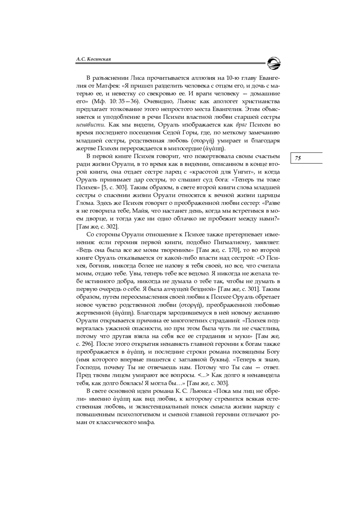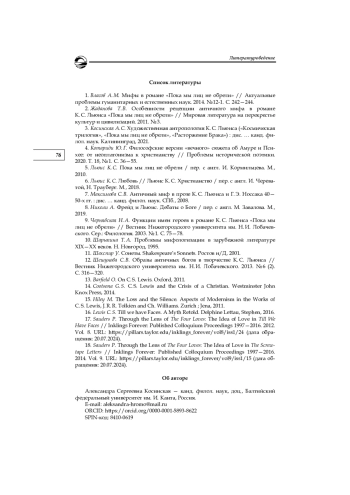 3. Косинская А. С. Художественная антропология К. С. Льюиса (“Космическая трилогия”, “Пока мы лиц не обрели”, “Расторжение Брака”): дис. … канд. филол. наук. Калининград, 2021. EDN: QICGMC
