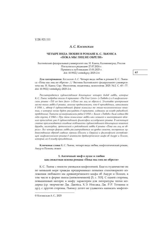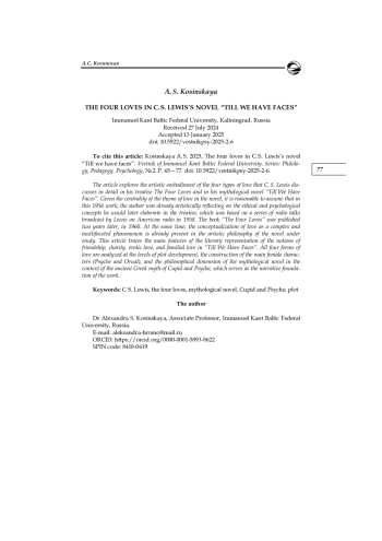 Рассматривается художественное воплощение четырех видов любви, которые К. С. Льюис подробно описал в трактате «The Four Loves» («Любовь») и в мифологическом романе «Till we have faces» («Пока мы лиц не обрели»). Учитывая центральное место темы любви в романе, логично предположить, что в произведении, написанном в 1956 г., автор в художественной форме осмыслил те этико-психологические понятия, о которых позже будет рассуждать в трактате, изданном на основе радиобесед, проведенных Льюисом на американском радио в 1958 г. Книга «Любовь» была издана два года спустя, в 1960 г. При этом осмысление любви как сложного и многогранного явления происходит уже в художественной философии исследуемого романа. В настоящей статье прослеживаются основные особенности художественного воплощения понятий дружбы, милосердия, эротической и родственной любви в романе «Пока мы лиц не обрели». Все четыре формы любви рассматриваются на уровне сюжета, построения художественных образов главных героинь (Психеи и Оруали) и философской составляющей мифологического романа в контексте древнегреческого мифа об Амуре и Психее, который лег в основу произведения