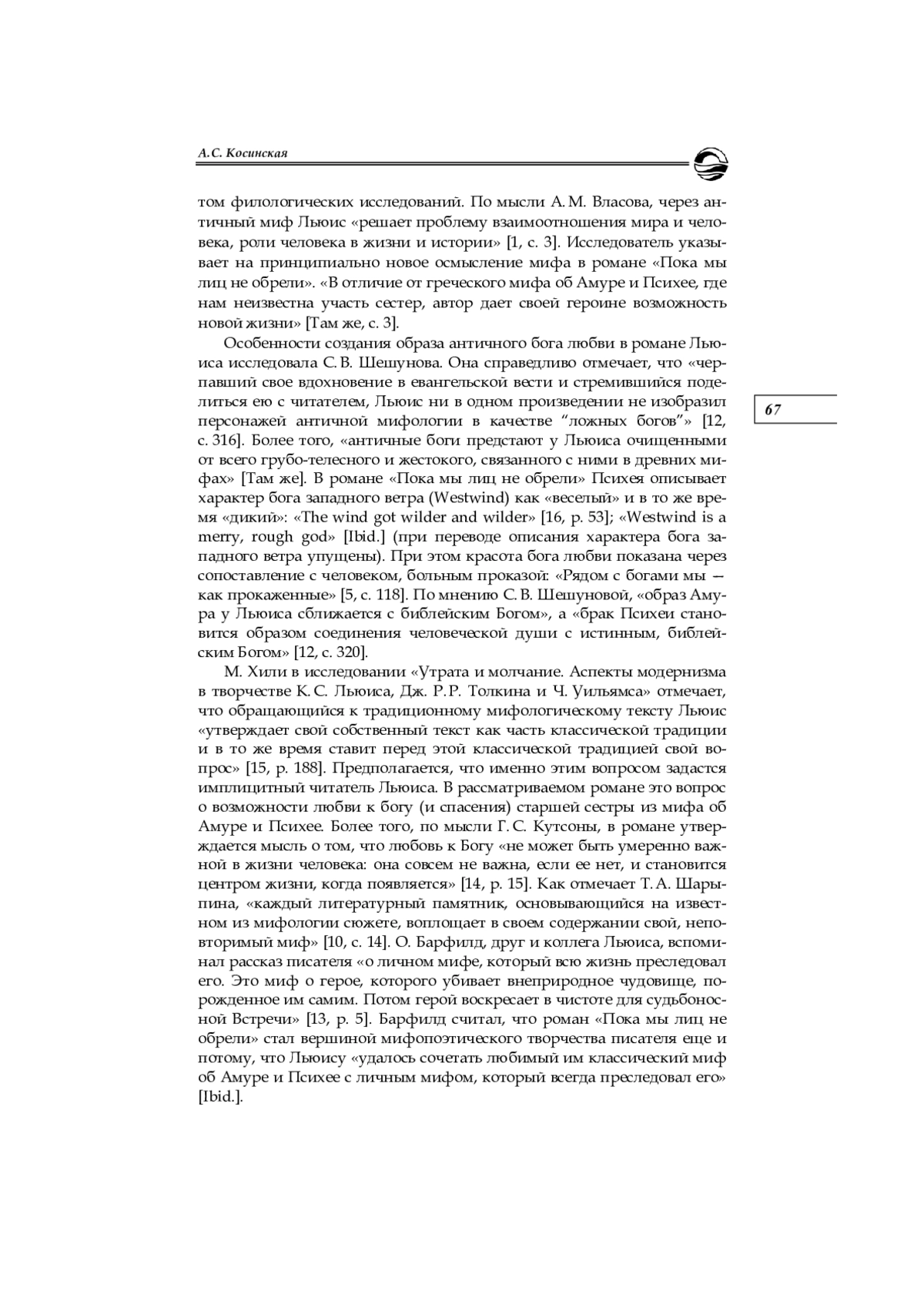 9. Чернявская Н. А. Функции имен героев в романе К. С. Льюиса “Пока мы лиц не обрели” // Вестник Нижегородского университета им. Н. И. Лобачевского. Сер.: Филология. 2003. № 1. С. 75-78.