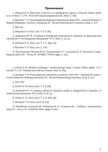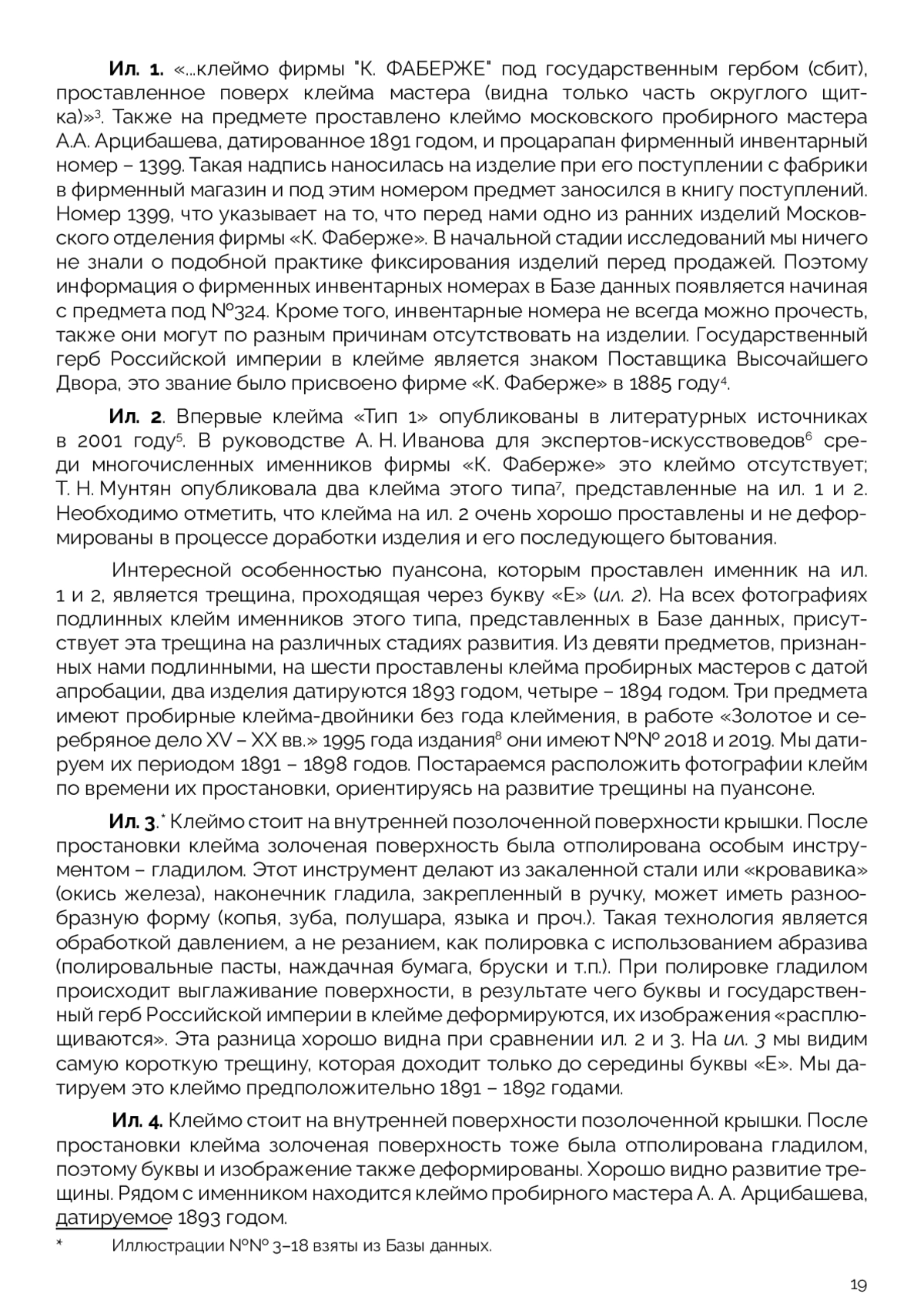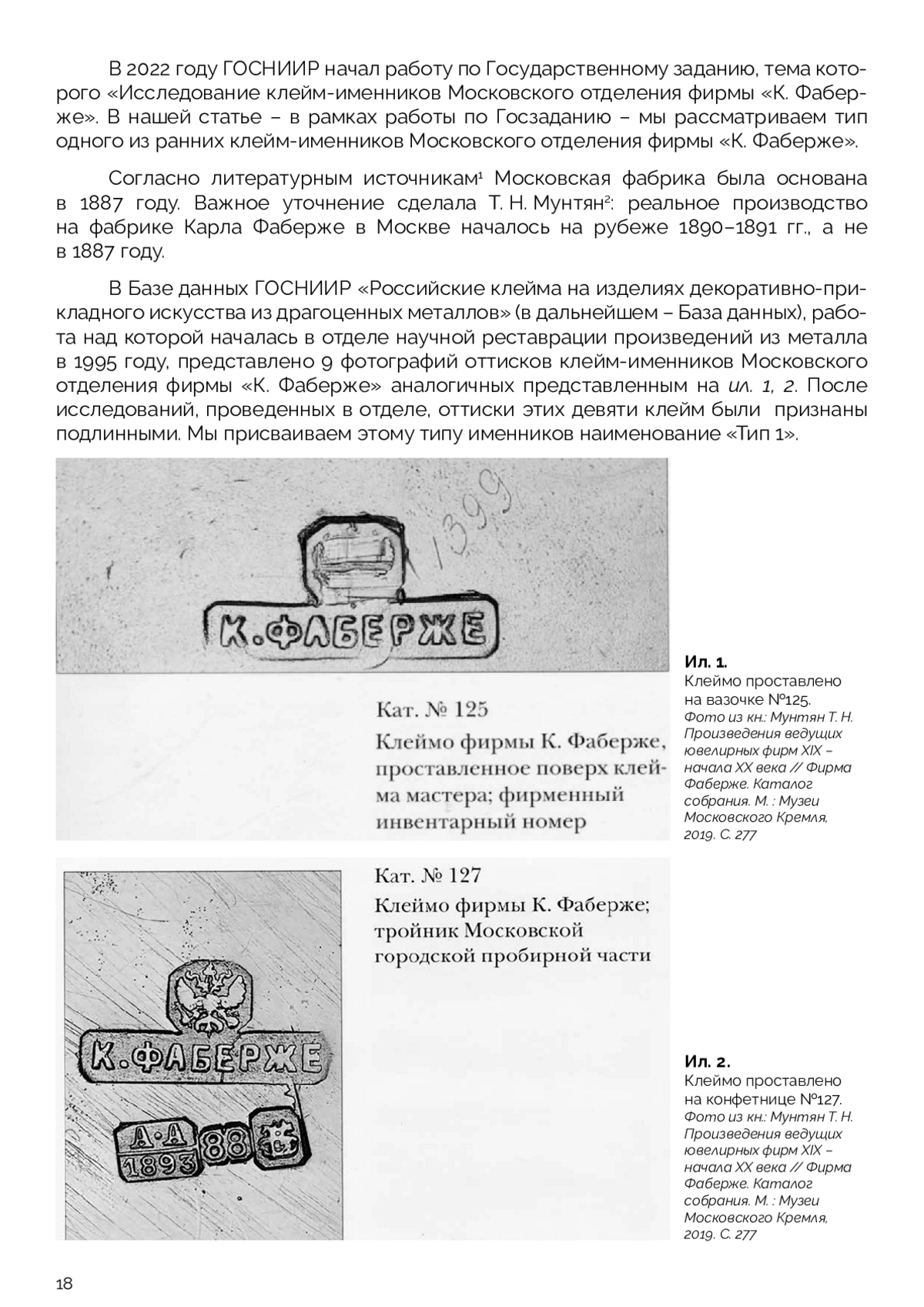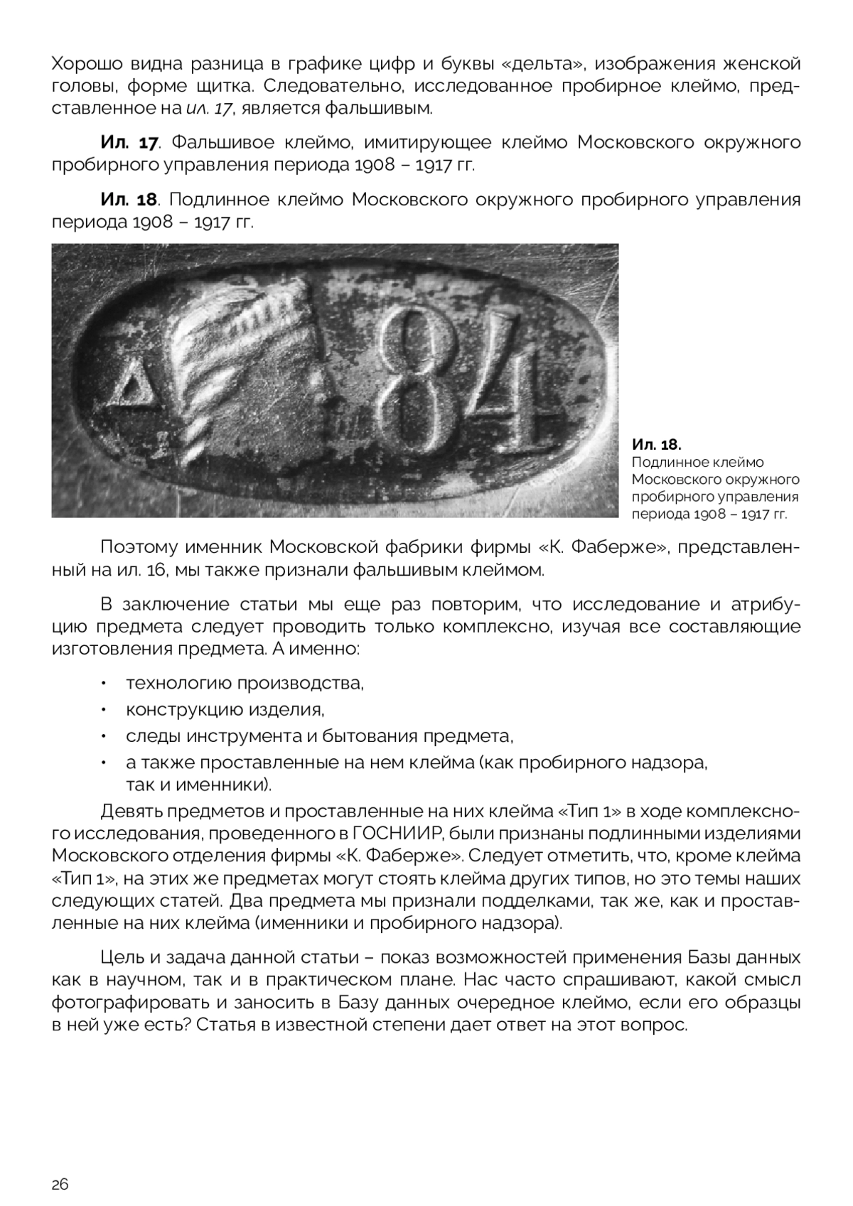 Цель статьи: показать возможности применения Базы данных ГОСНИИР «Российские клейма на изделиях декоративно-прикладного искусства из драгоценных металлов» как в научном плане – публикация клейм в хорошем качестве изображения и возможностей проведения их сравнительного анализа, а также введения их в научный оборот, так и в практическом – выявление фальшивых клейм. В статье рассматривается тип раннего клейма-именника Московского отделения фирмы «К. Фаберже». Впервые в значительном объеме и высоком качестве публикуются изображения этого типа именников, также впервые публикуются фальшивые именники этого типа и сопутствующие им фальшивые клейма пробирного надзора. Особое внимание уделяется сравнительному анализу изображений клейм, что позволяет отличать подлинные клейма от фальшивых, а также влиянию условий простановки и бытования клейма на состояние его оттиска на предмете. Также подчеркивается необходимость комплексных исследований предметов при исследовании изделий декоративно-прикладного искусства из драгоценных металлов.