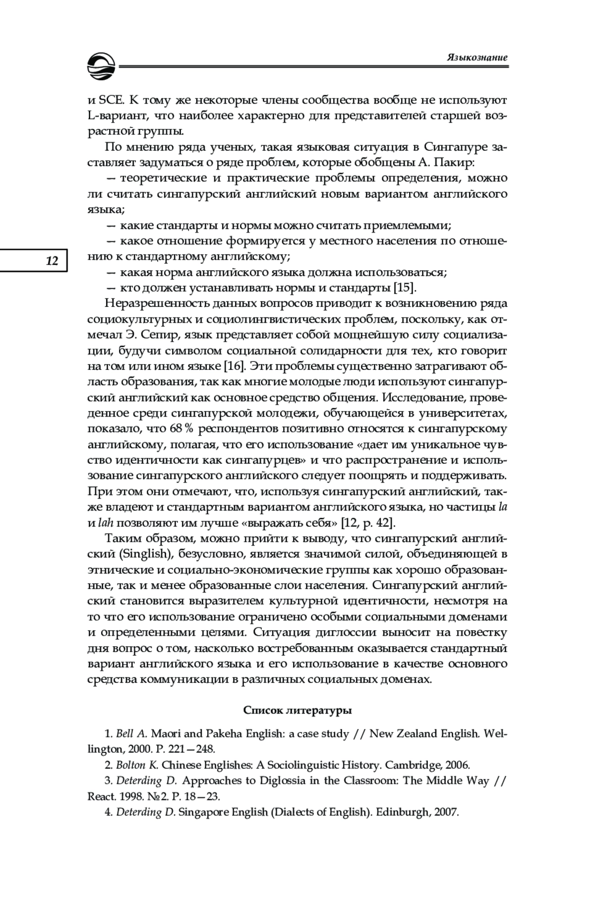 4. Deterding D. Singapore English (Dialects of English). Edinburgh, 2007.