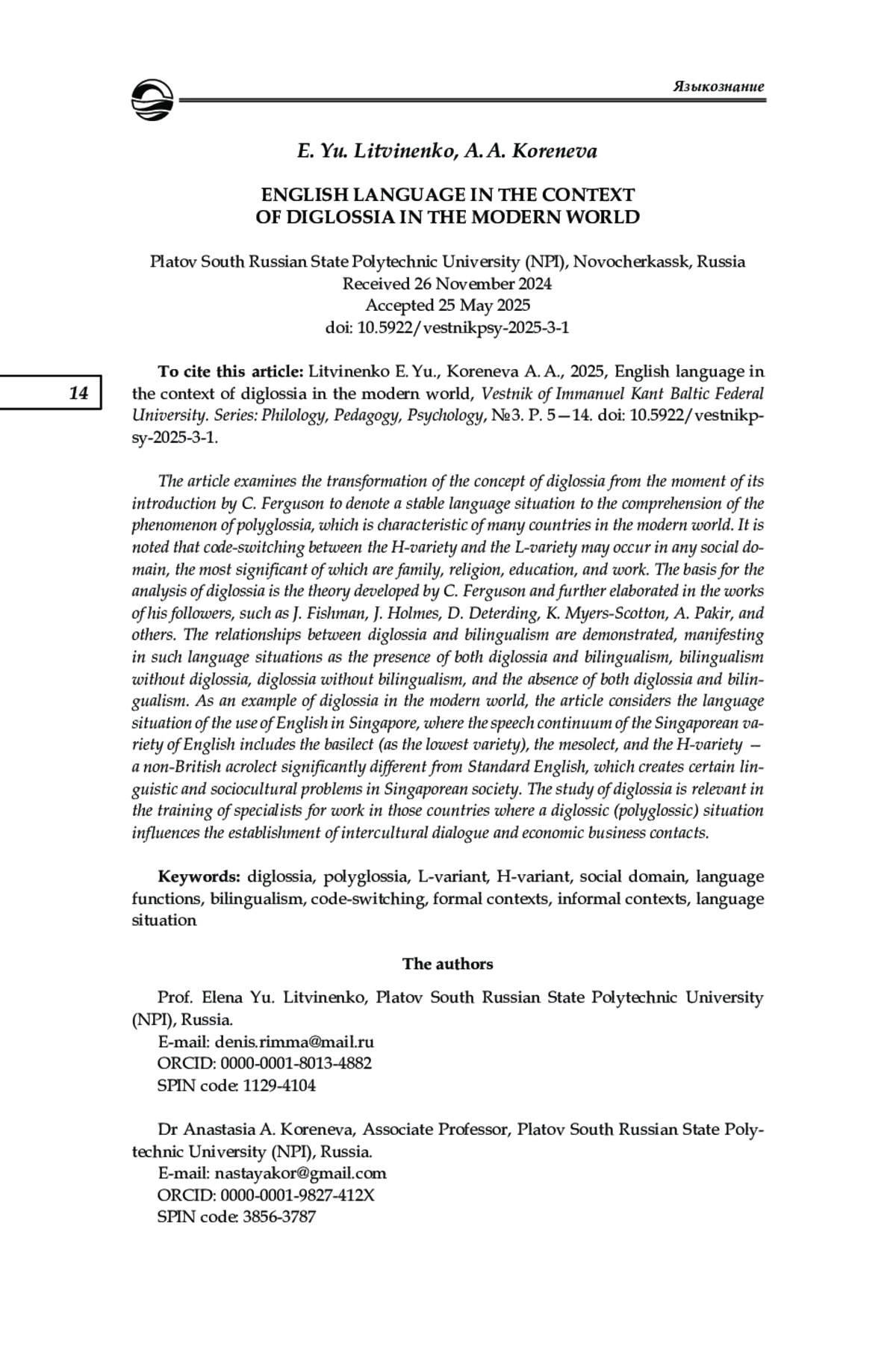 Рассматривается трансформация понятия диглоссии с момента его введения Ч. Фергюсоном для обозначения стабильной языковой ситуации до осмысления явления полиглоссии, характерной для многих стран в современном мире. Отмечено, что переключение языкового кода между H-вариантом и L-вариантом может происходить в любом социальном домене, наиболее значимыми из которых являются семья, религия, образование и работа. Основой для анализа диглоссии послужила теория, разработанная Ч. Фергюсоном и развитая в работах его последователей, таких как Дж. Фишман, Дж. Холмс, Д. Детердинг, К. Майерс-Скоттон, А. Пакир и др. Показаны взаимоотношения между диглоссией и билингвизмом, проявляющиеся в таких языковых ситуациях, как наличие диглоссии и билингвизма, билингвизма без диглоссии, диглоссии без билингвизма, отсутствие как диглоссии, так и билингвизма. В качестве примера диглоссии в современном мире рассмотрена языковая ситуация использования английского языка в Сингапуре, где в речевой континуум сингапурского варианта английского входят базилект (как самый низкий вариант), мезолект и вариант H — небританский акролект, существенно отличающийся от стандартного английского языка, что создает определенные лингвокультурные и социокультурные проблемы в сингапурском обществе. Изучение диглоссии актуально при подготовке специалистов для работы в тех странах, где диглоссная (полиглоссная) ситуация влияет на установление межкультурного диалога и экономических деловых контактов