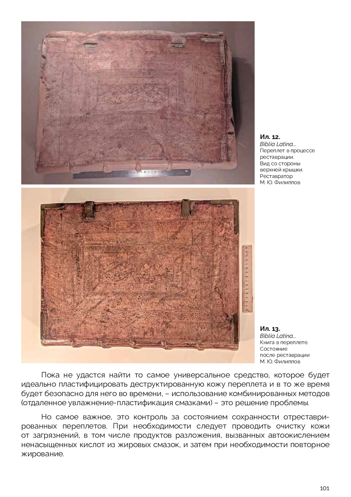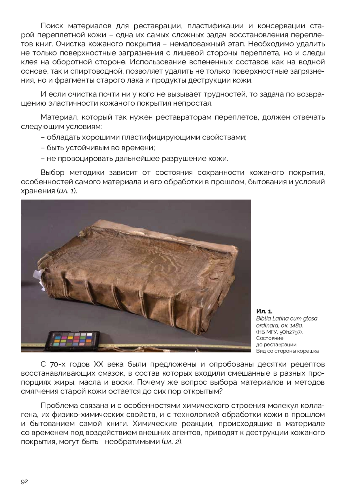 В статье говорится о проблемах, которые возникают у реставраторов при выборе материалов для консервации переплетной кожи. Одна их самых сложных задач при этом – восстановление эластичности оригинального кожаного покрытия. Автор обращает внимание на то, что выбор методики реставрационных (консервационных) работ зависит от состояния сохранности кожаного покрытия, особенностей самого материала и его обработки в прошлом, бытования и условий хранения. Химические реакции, происходящие в материале со временем под воздействием внешних агентов, приводят к деструкции кожаного покрытия, могут быть необратимыми. В статье изложены основные причины разрушения кожи, приведены агенты, которые оказывают негативное влияние на ее состояние сохранности. Изучение механизмов разрушения кожи показало, что использование смазок для ее пластификации может иметь негативное влияние на состояние сохранности в будущем. Но даже при использовании смягчающих составов не всегда удается достичь положительного результата. Автор делает вывод, что использование комбинированных методов для пластификации эффективно при работе с кожей, потерявшей эластичные свойства. Такую методику, включающую отдаленное увлажнение кожи и обработку смазками, использовали при реставрации кожаного переплета книги XV века, сильно пострадавшей в процессе бытования. В настоящее время в отделе научной реставрации рукописей и графики ГОСНИИР ведется работа по изучению возможности использования лецитина для реставрации кожи. Особенности строения лецитина делают его хорошим увлажняющим поверхностно-активным материалом. Известно, что в конце 80-х годов XX века он применялся при реставрации задубевшей кожи кареты XVII века.