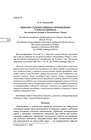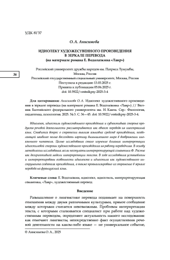 Идиолект, идиостиль художественного произведения и субъективная сторона продукта речевой деятельности рассматриваются как объект перевода на иностранный язык. Ставится вопрос о стратегии анализа языковых средств произведения, позволяющей наиболее полно воссоздать картину вымышленного мира в воображении иноязычного читателя. Целью исследования стало изучение влияния интерпретации идиостилевой стороны художественного произведения на работу переводчика. В основу методологии исследования легли постулаты интерпретирующей семантики Ф. Растье как дескриптивной модели интерпретации текста. В ходе исследования установлены и интерпретированы особенности идиолекта и идиостиля как художественного инструмента создателя произведения, а также проанализировано их отражение в зеркале перевода на французский язык.