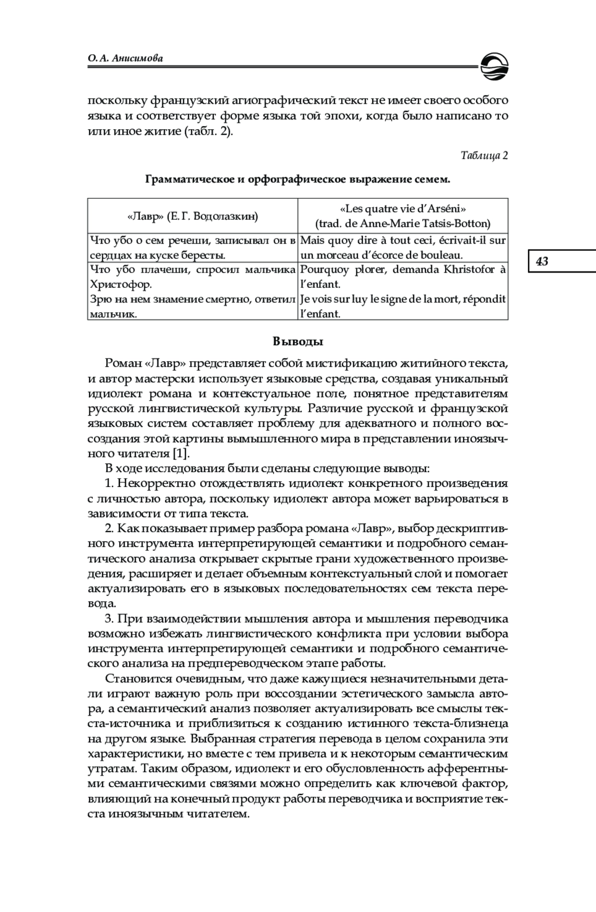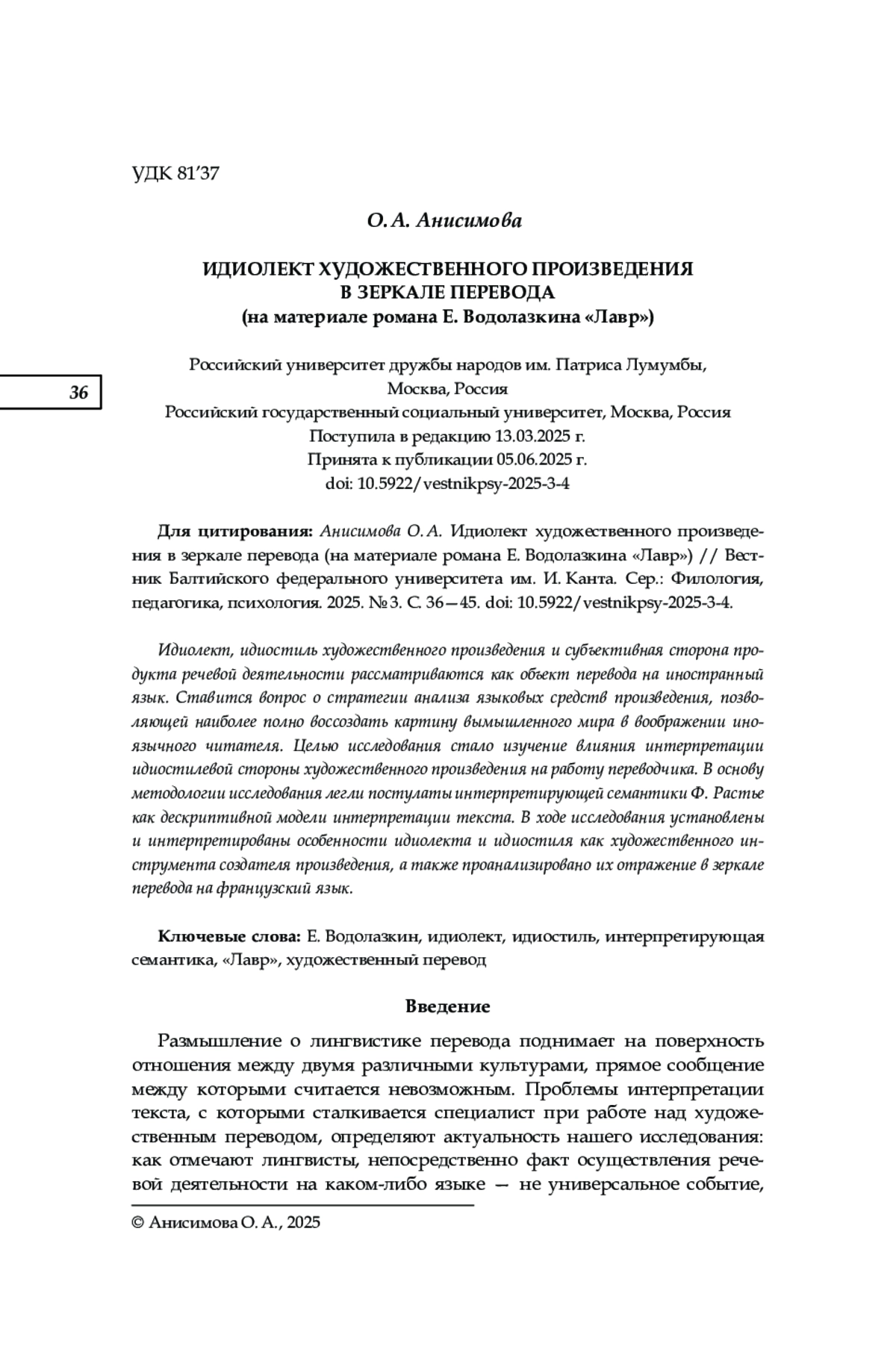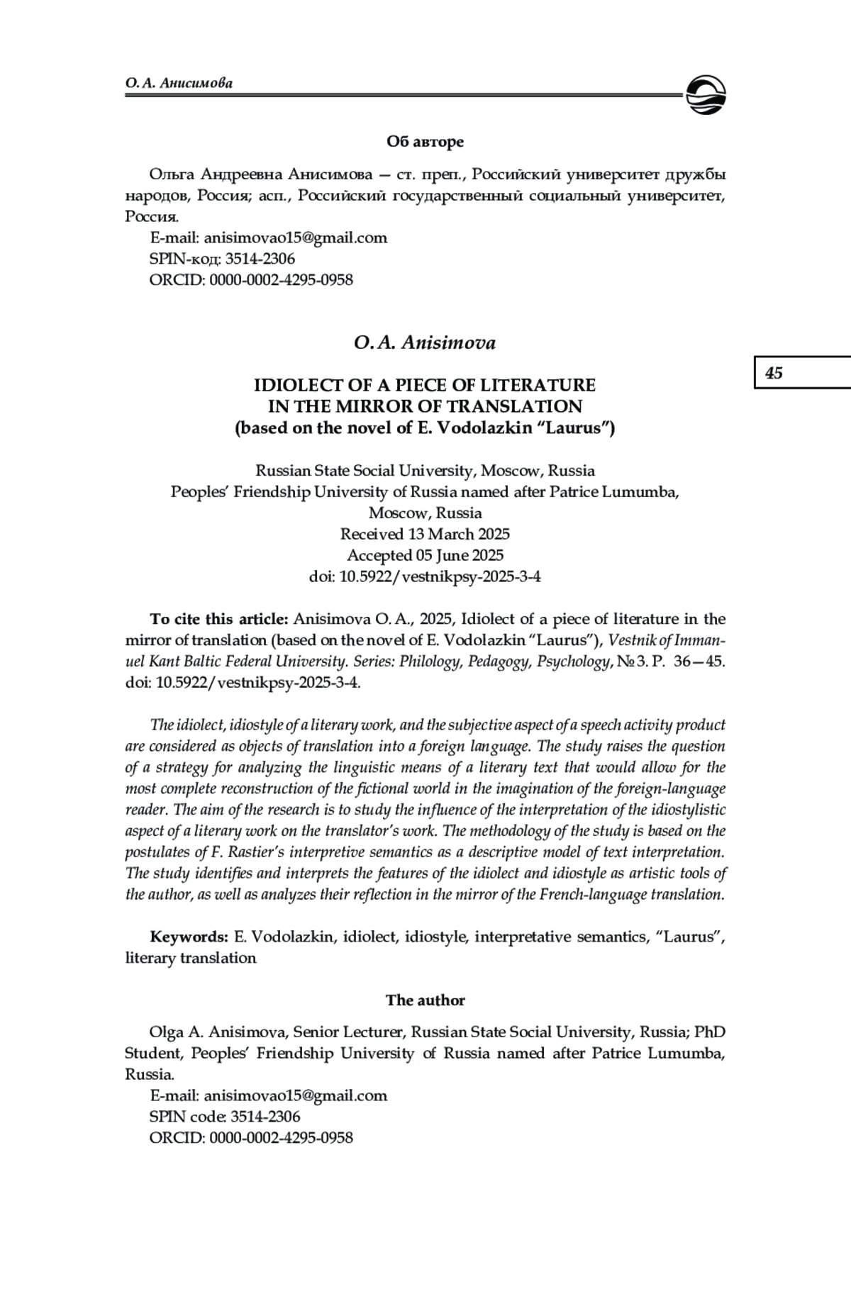 1. Анисимова О. А. К вопросу о презумпции изотопии в художественном тексте как объекте перевода // Казанская наука. 2024. № 9. С. 275-277. EDN: IVQJDJ