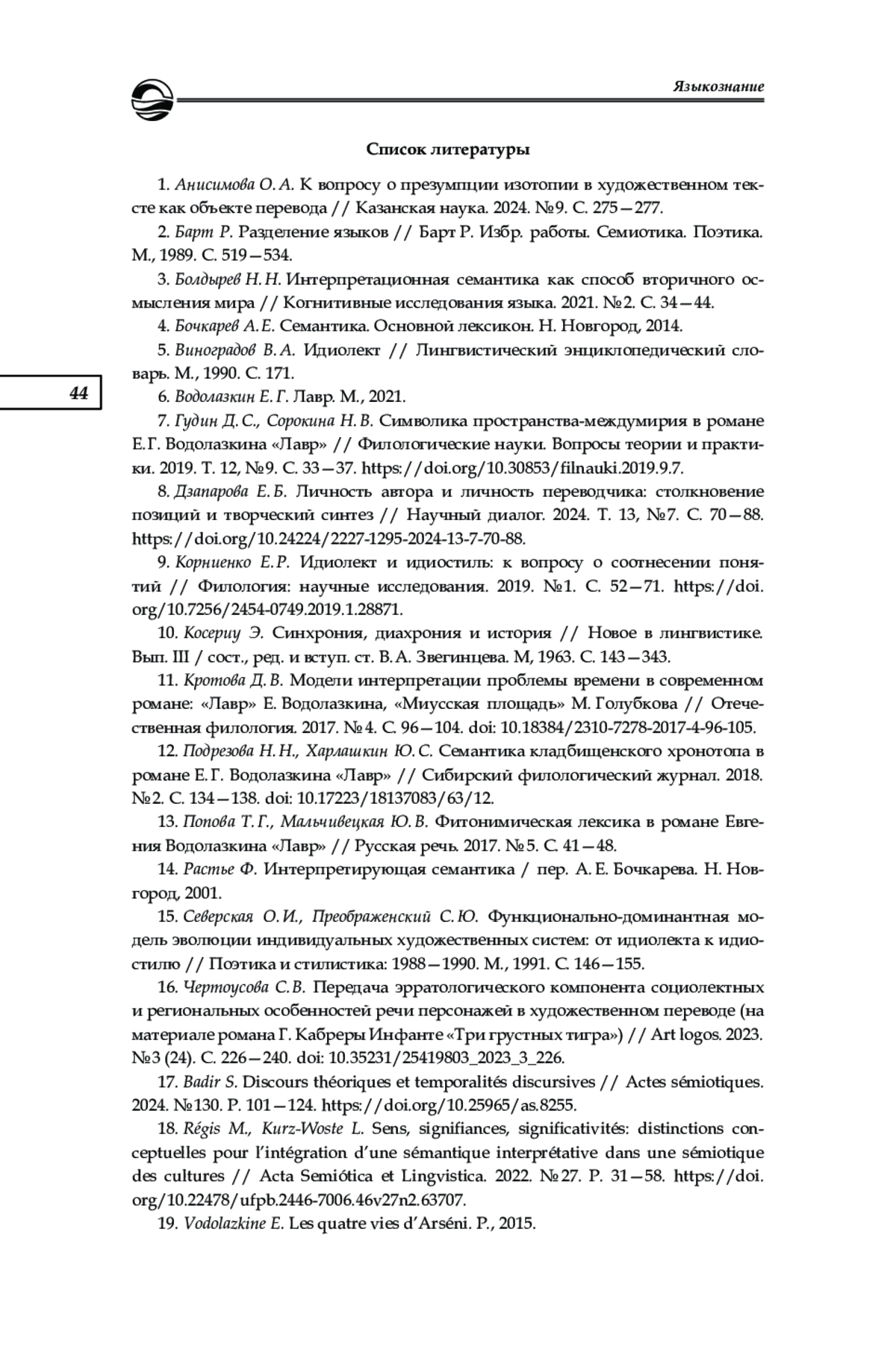 7. Гудин Д. С., Сорокина Н. В. Символика пространства-междумирия в романе Е. Г. Водолазкина “Лавр” // Филологические науки. Вопросы теории и практики. 2019. Т. 12, № 9. С. 33-37. DOI: 10.30853/filnauki.2019.9.7 EDN: CRECYV