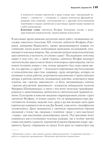 В настоящее время написано достаточно много работ, посвященных наследию известного богослова XIX столетия святителя Феофана (Говорова), затворника Вышенского, однако продолжающееся издание его сочинений, писем делает необходимым проведение исследований, уточняющих те или иные вопросы. Так, уточнения требуют антропологические идеи святителя, в частности, его учение о душе1. Исследование этой темы важно в силу того, что, с одной стороны, святитель Феофан наследует святоотеческие идеи (а они не были в этом вопросе единообразны, так что можно поставить вопрос о том, почему приоритет был отдан одним идеям, а не другим), а с другой— использует современные ему богословские и психологические идеи (так, например, среди литературы, которую он упоминает в своих работах, встречаются католические и протестантские авторы; в работах святителя, посвященных аскетике, встречаются такие понятия, как «чувство зависимости» от Бога, напоминающее понятие «чувства абсолютной зависимости» основателя либеральной теологии Фридриха Шлейермахера), в связи с чем могут несколько трансформироваться и заимствованные святителем из святоотеческой традиции понятия.
