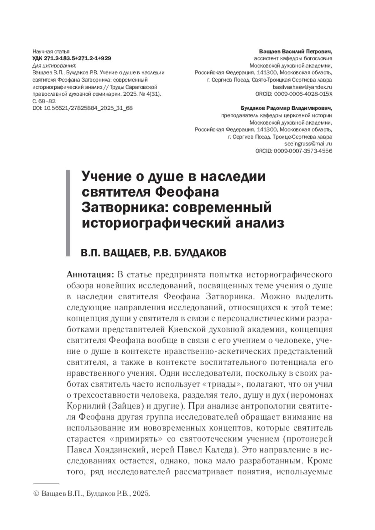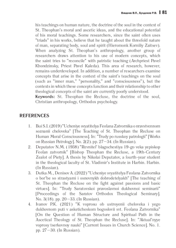 5. Каледа П.И., диак. Свт. Феофан Затворник и антропология киевской духовной школы // Вестник Екатеринбургской духовной семинарии. 2019. № 4 (28). С. 110-123. EDN: ZZBOWJ