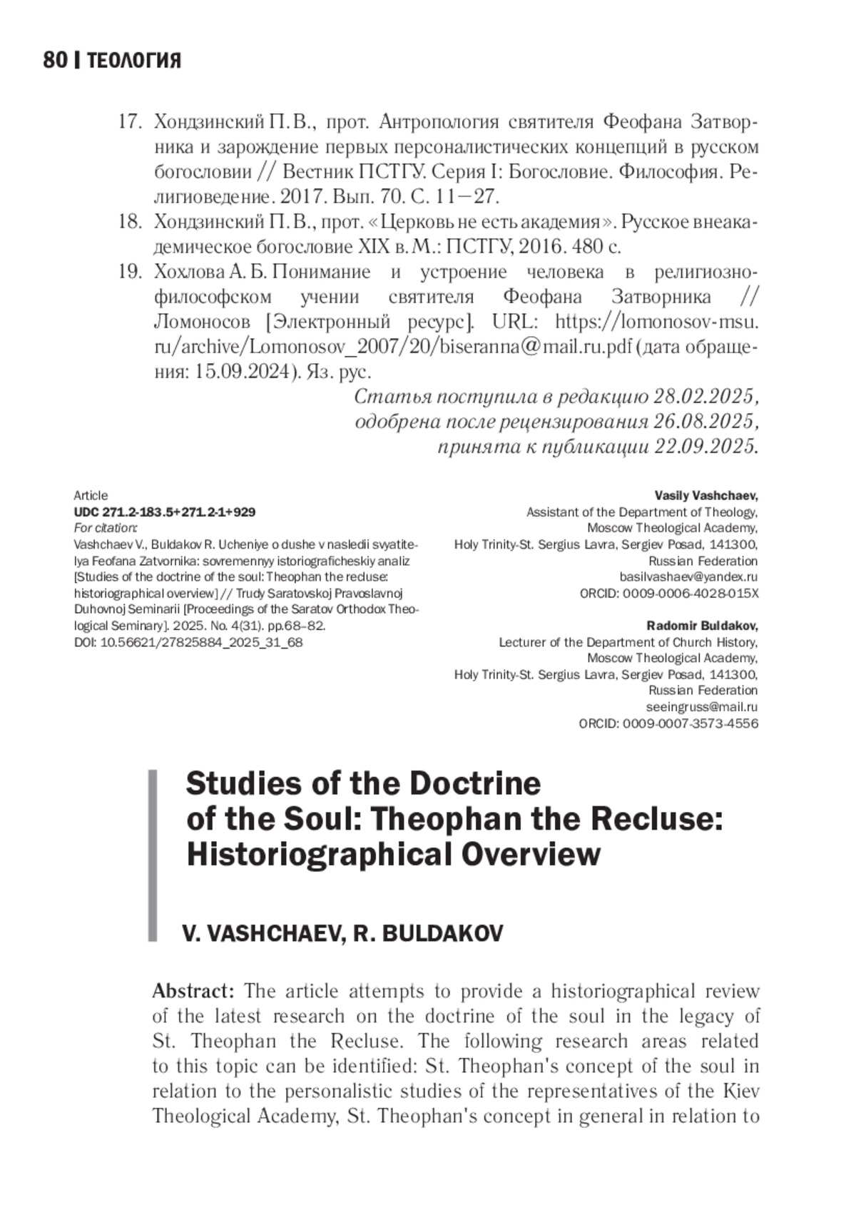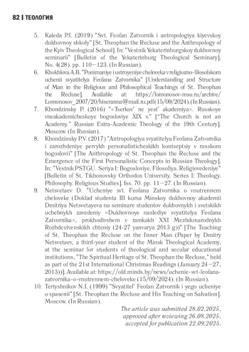 17. Хондзинский П.В., прот. Антропология святителя Феофана Затворника и зарождение первых персоналистических концепций в русском богословии // Вестник ПСТГУ. Серия I: Богословие. Философия. Религиоведение. 2017. Вып. 70. С. 11-27. EDN: YLEBOZ