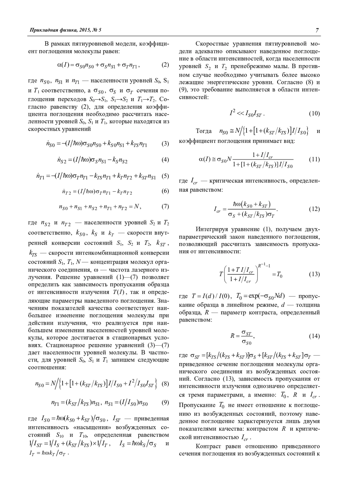 Зависимость пропускания оптического элемента, активированного органическими соединениями, проявляющими наведенное поглощение, однозначно определяется тремя параметрами: контрастом, критической интенсивностью и начальным пропусканием. Два из них — контраст и критическая интенсивность — являются определяющими параметрами наведенного поглощения органических соединений. Для их корректного определения необходимо проведение исследования пропускания от плотности энергии в условиях стационарного распределения электронов по энергетическим уровням молекулы. Кроме того, необходимо, чтобы измерение пропускания было осуществлено в линейном режиме, в области насыщения поглощения органического соединения, а также при каком-либо промежуточном значении плотности энергии лазерного излучения. Развитые представления адекватно описывают экспериментальные данные, представленные в литературе.