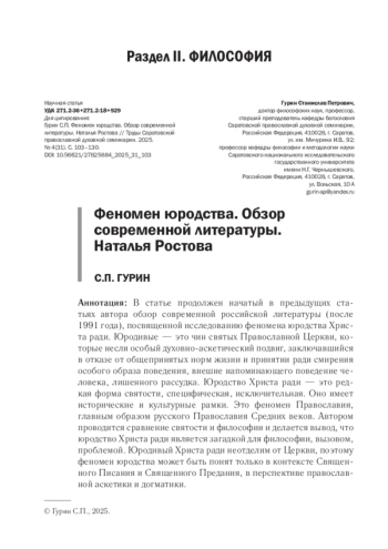 В статье продолжен начатый в предыдущих статьях автора обзор современной российской литературы (после 1991 года), посвященной исследованию феномена юродства Христа ради. Юродивые - это чин святых Православной Церкви, которые несли особый духовно-аскетический подвиг, заключавшийся в отказе от общепринятых норм жизни и принятии ради смирения особого образа поведения, внешне напоминающего поведение человека, лишенного рассудка. Юродство Христа ради - это редкая форма святости, специфическая, исключительная. Оно имеет исторические и культурные рамки. Это феномен Православия, главным образом русского Православия Средних веков. Автором проводится сравнение святости и философии и делается вывод, что юродство Христа ради является загадкой для философии, вызовом, проблемой. Юродивый Христа ради неотделим от Церкви, поэтому феномен юродства может быть понят только в контексте Священного Писания и Священного Предания, в перспективе православной аскетики и догматики.