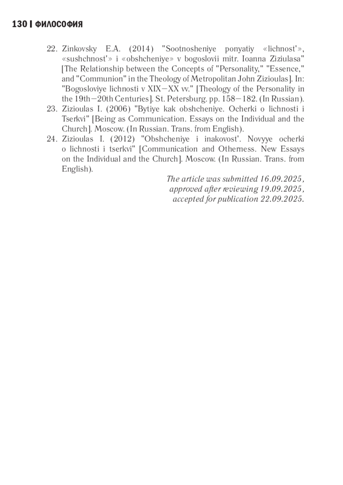 17. Мефодий (Зинковский С. А.), иером. Соотношение понятий “личность”, “сущность” и “общение” в богословии митр. Иоанна Зизиуласа // Богословие личности в XIX-XX вв. СПб.: Изд-во Олега Абышко, 2014. С. 158-182.
