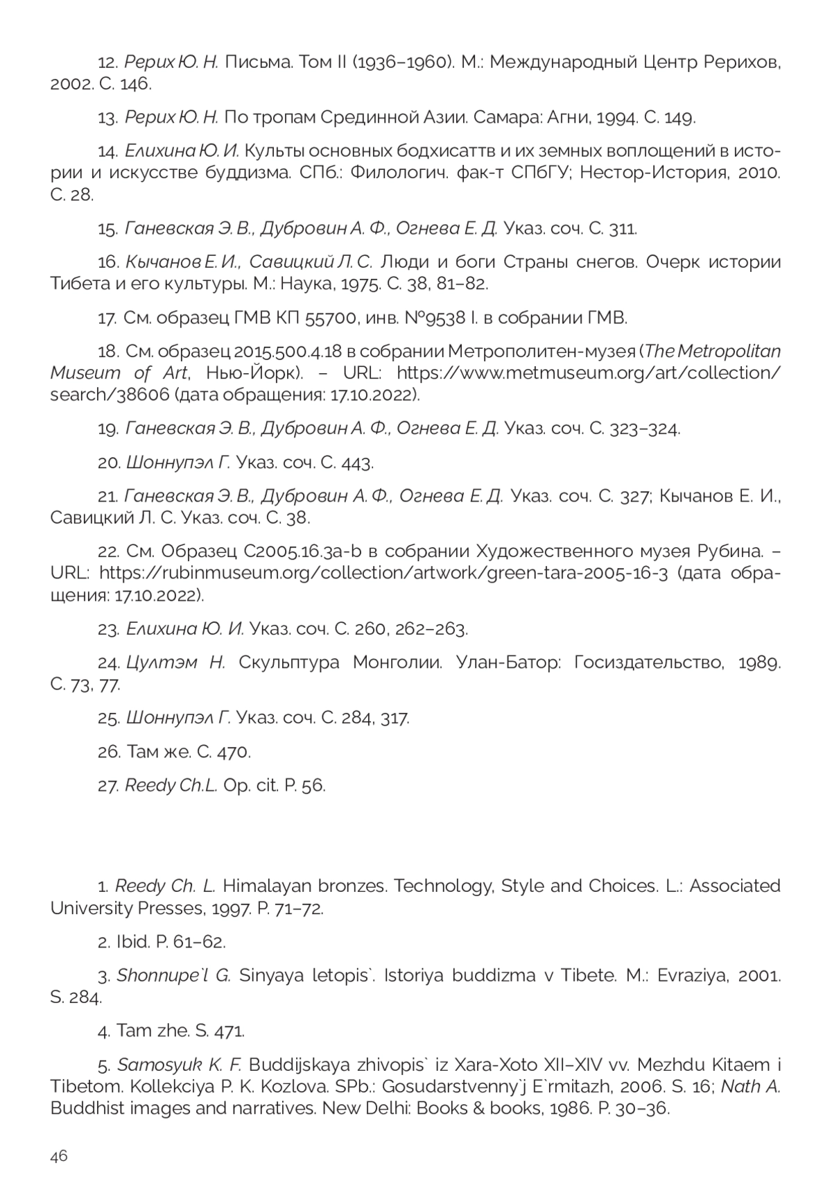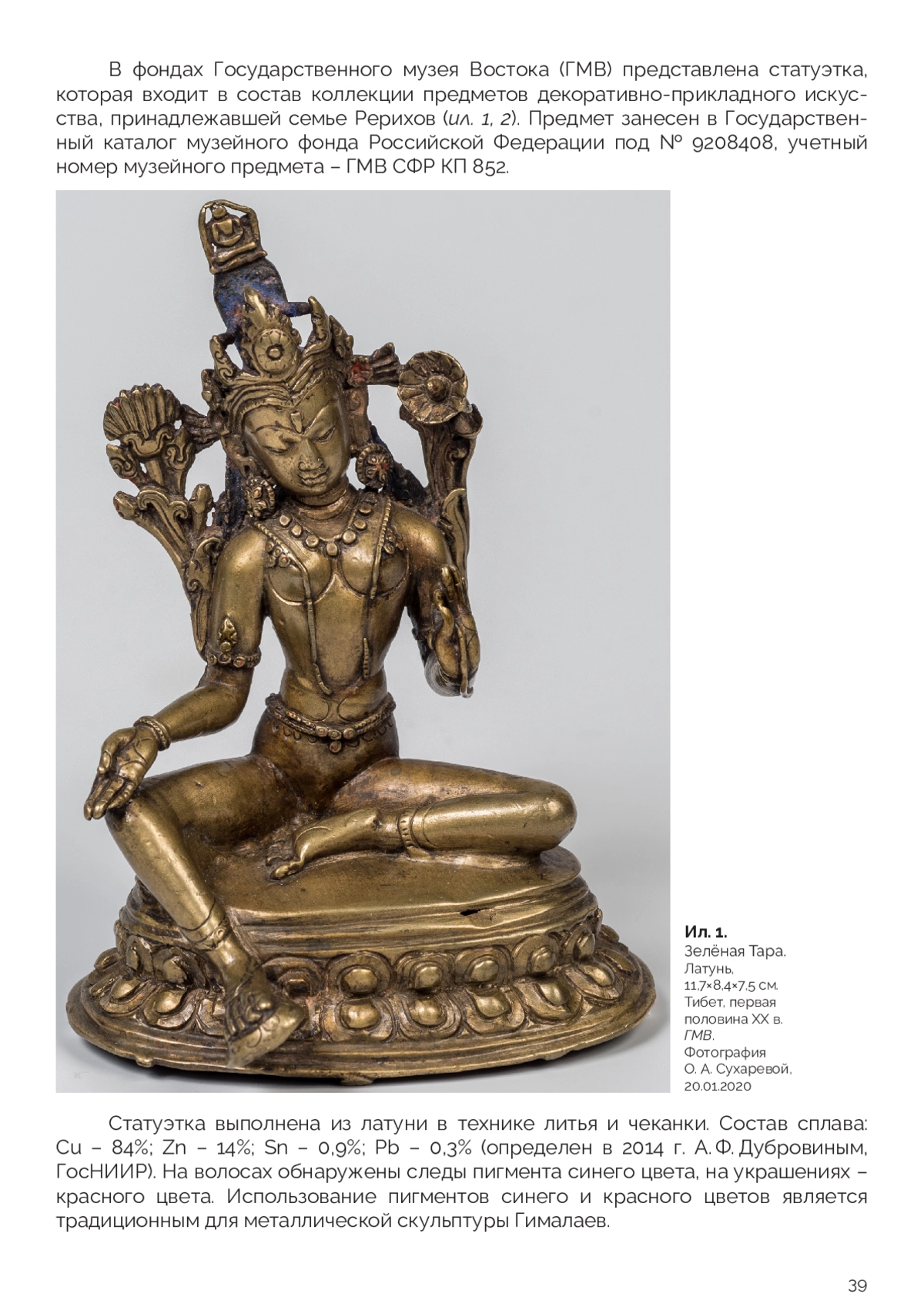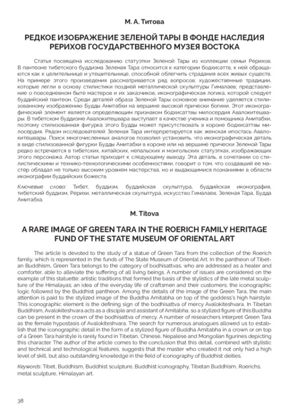 Статья посвящена исследованию статуэтки Зеленой Тары из коллекции семьи Рерихов. В пантеоне тибетского буддизма Зеленая Тара относится к категории бодхисаттв, к ней обращаются как к целительнице и утешительнице, способной облегчить страдания всех живых существ. На примере этого произведения рассматривается ряд вопросов: художественные традиции, которые легли в основу стилистики поздней металлической скульптуры Гималаев; представление о повседневном быте мастеров и их заказчиков; иконографическая логика, которой следует буддийский пантеон. Среди деталей образа Зеленой Тары основное внимание уделяется стилизованному изображению Будды Амитабхи на вершине высокой прически богини. Этот иконографический элемент является определяющим признаком бодхисаттвы милосердия Авалокитешвары. В тибетском буддизме Авалокитешвара выступает в качестве ученика и помощника Амитабхи, поэтому стилизованная фигурка этого Будды может присутствовать в короне бодхисаттвы милосердия. Рядом исследователей Зеленая Тара интерпретируется как женская ипостась Авалокитешвары. Поиск многочисленных аналогов позволил установить, что иконографическая деталь в виде стилизованной фигурки Будды Амитабхи в короне или на вершине прически Зеленой Тары редко встречается в тибетских, китайских, непальских и монгольских статуэтках, изображающих этого персонажа. Автор статьи приходит к следующему выводу. Эта деталь, в сочетании со стилистическими и технико-технологическими особенностями, говорит о том, что создавший ее мастер обладал не только высоким уровнем мастерства, но и выдающимися познаниями в области иконографии буддийских божеств.