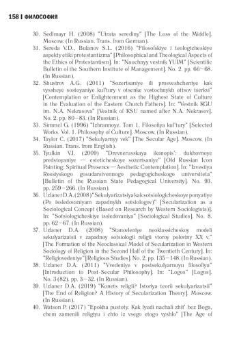 45. Узланер Д. А. Становление неоклассической модели секуляризации в западной социологии религии второй половины ХХ в. // Религиоведение. 2008. № 2. С. 135-148. EDN: JUZZZZ