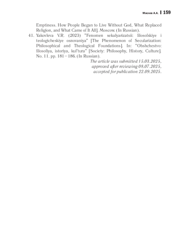 50. Яковлева В. Р. Феномен секуляризации: философские и теологические основания // Общество: философия, история, культура. 2023. № 11. С. 181-186. EDN: OZMUJM
