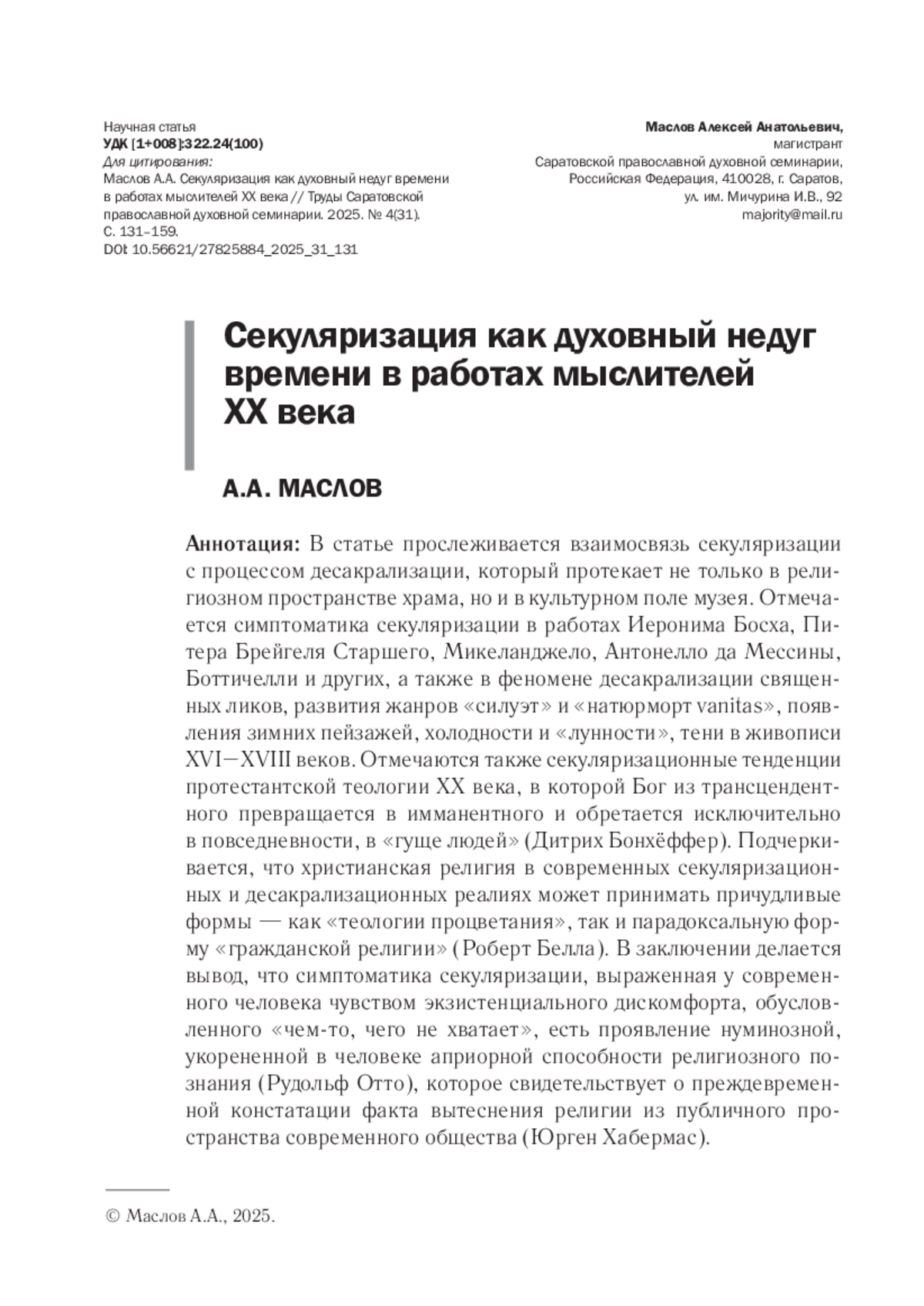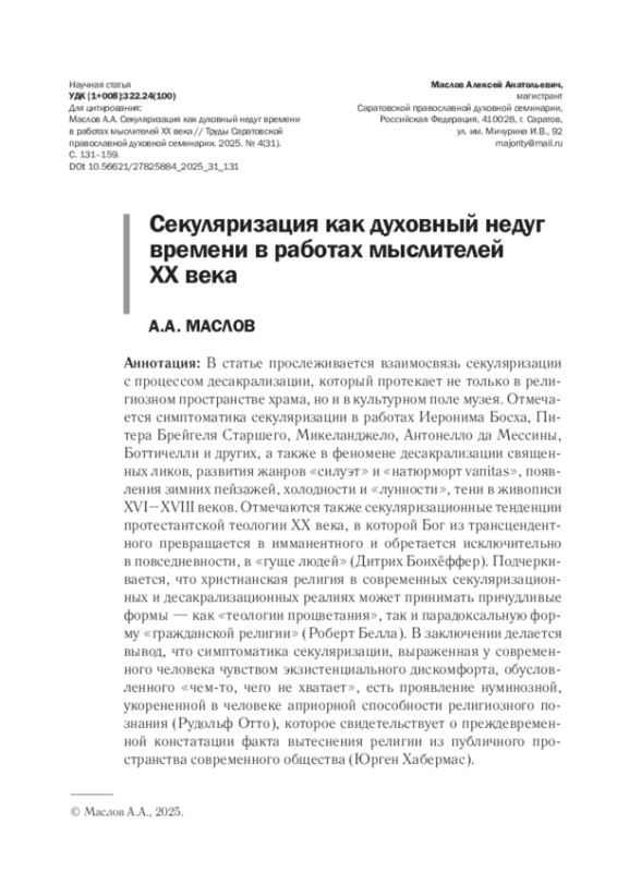 В статье прослеживается взаимосвязь секуляризации с процессом десакрализации, который протекает не только в религиозном пространстве храма, но и в культурном поле музея. Отмечается симптоматика секуляризации в работах Иеронима Босха, Питера Брейгеля Старшего, Микеланджело, Антонелло да Мессины, Боттичелли и других, а также в феномене десакрализации священных ликов, развития жанров «силуэт» и «натюрморт vanitas», появления зимних пейзажей, холодности и «лунности», тени в живописи XVI-XVIII веков. Отмечаются также секуляризационные тенденции протестантской теологии ХХ века, в которой Бог из трансцендентного превращается в имманентного и обретается исключительно в повседневности, в «гуще людей» (Дитрих Бонхёффер). Подчеркивается, что христианская религия в современных секуляризационных и десакрализационных реалиях может принимать причудливые формы - как «теологии процветания», так и парадоксальную форму «гражданской религии» (Роберт Белла). В заключении делается вывод, что симптоматика секуляризации, выраженная у современного человека чувством экзистенциального дискомфорта, обусловленного «чем-то, чего не хватает», есть проявление нуминозной, укорененной в человеке априорной способности религиозного познания (Рудольф Отто), которое свидетельствует о преждевременной констатации факта вытеснения религии из публичного пространства современного общества (Юрген Хабермас).