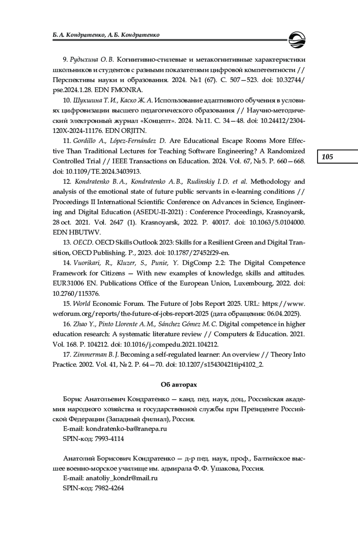 12. Kondratenko B. A., Kondratenko A. B., Rudinskiy I. D. et al. Methodology and analysis of the emotional state of future public servants in e-learning conditions // Proceedings II International Scientific Conference on Advances in Science, Engineering and Digital Education (ASEDU-II-2021): Conference Proceedings, Krasnoyarsk, 28 oct. 2021. Vol. 2647 (1). Krasnoyarsk, 2022. P. 40017. DOI: 10.1063/5.0104000 EDN: HBUTWV