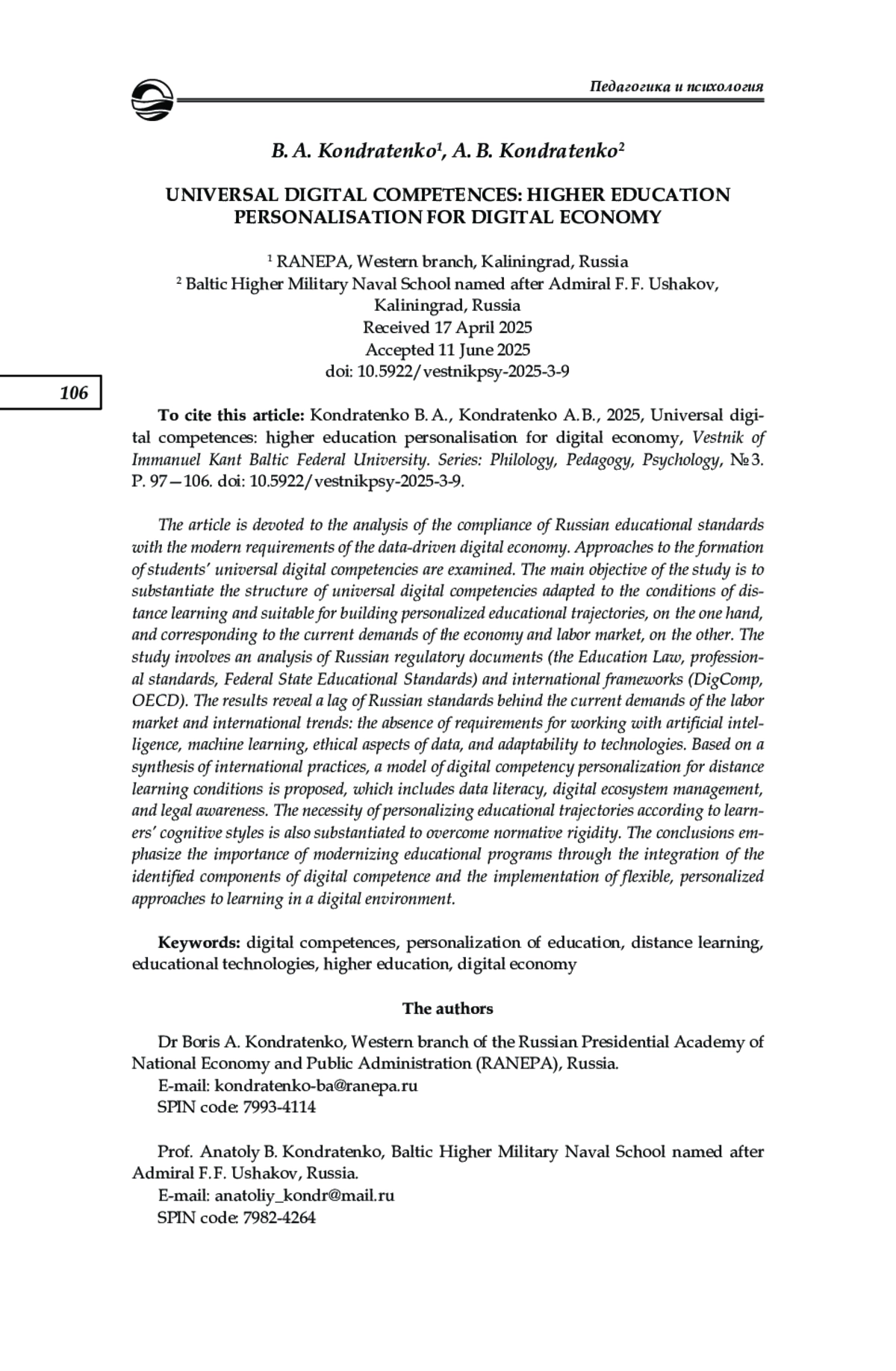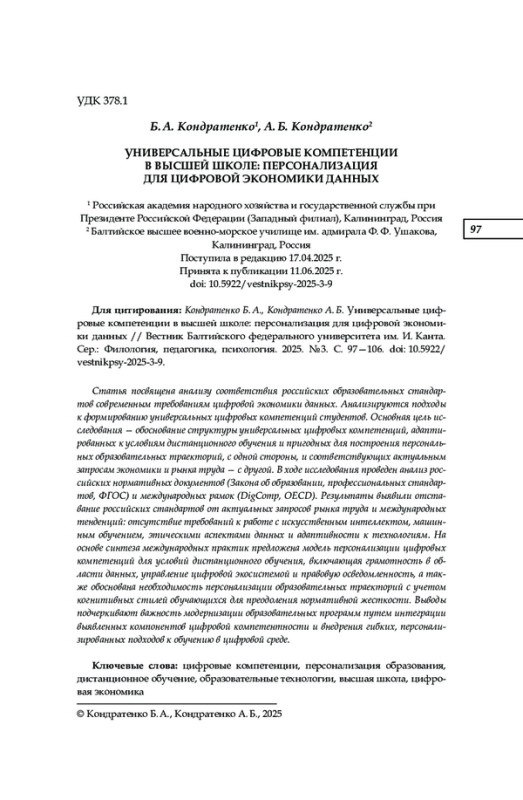 Статья посвящена анализу соответствия российских образовательных стандартов современным требованиям цифровой экономики данных. Анализируются подходы к формированию универсальных цифровых компетенций студентов. Основная цель исследования — обоснование структуры универсальных цифровых компетенций, адаптированных к условиям дистанционного обучения и пригодных для построения персональных образовательных траекторий, с одной стороны, и соответствующих актуальным запросам экономики и рынка труда — с другой. В ходе исследования проведен анализ российских нормативных документов (Закона об образовании, профессиональных стандартов, ФГОС) и международных рамок (DigComp, OECD). Результаты выявили отставание российских стандартов от актуальных запросов рынка труда и международных тенденций: отсутствие требований к работе с искусственным интеллектом, машинным обучением, этическими аспектами данных и адаптивности к технологиям. На основе синтеза международных практик предложена модель персонализации цифровых компетенций для условий дистанционного обучения, включающая грамотность в области данных, управление цифровой экосистемой и правовую осведомленность, а также обоснована необходимость персонализации образовательных траекторий с учетом когнитивных стилей обучающихся для преодоления нормативной жесткости. Выводы подчеркивают важность модернизации образовательных программ путем интеграции выявленных компонентов цифровой компетентности и внедрения гибких, персонализированных подходов к обучению в цифровой среде
