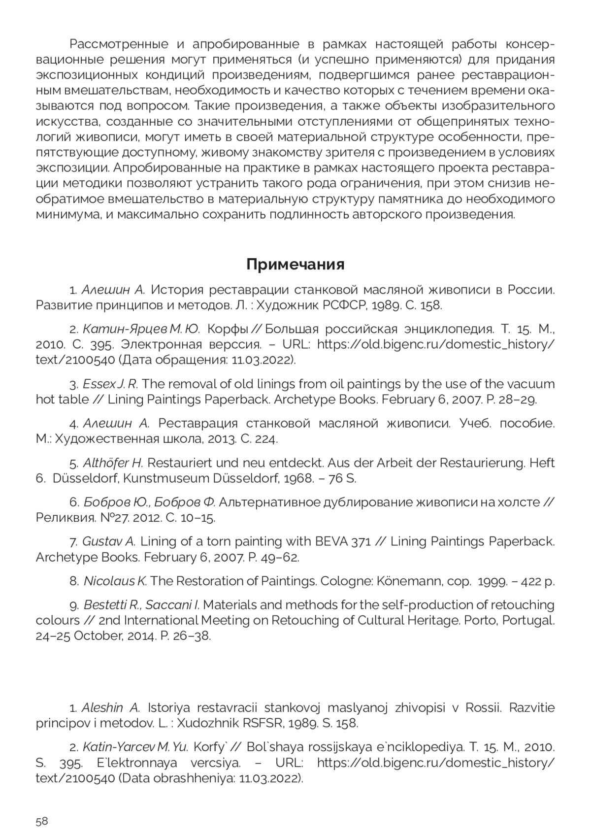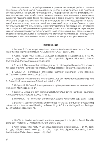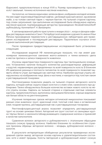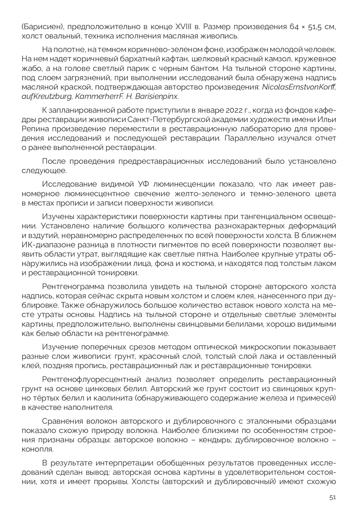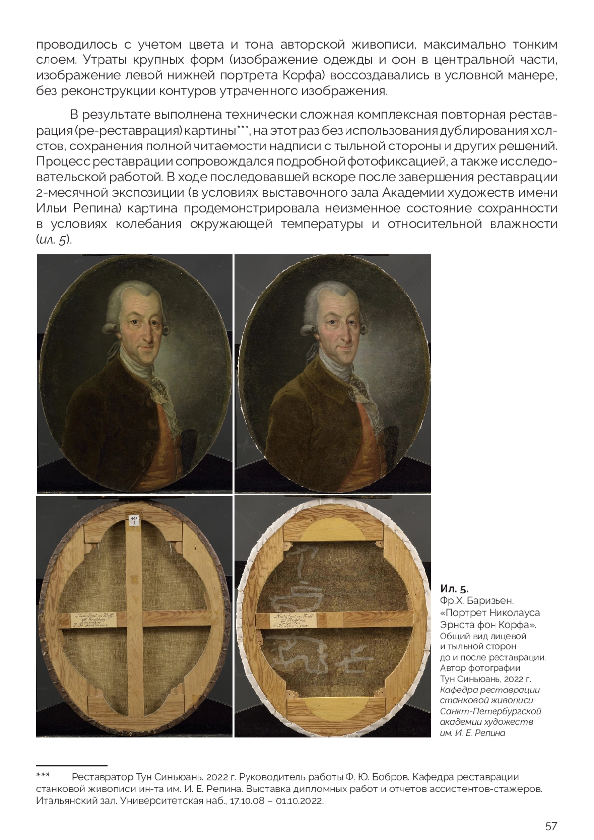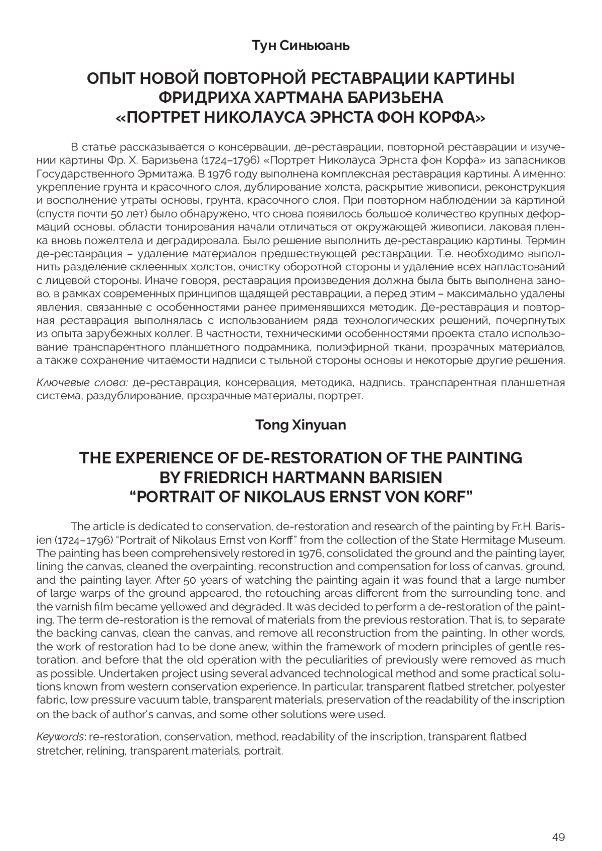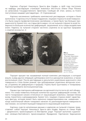 В статье рассказывается о консервации, де-реставрации, повторной реставрации и изучении картины Фр. Х. Баризьена (1724–1796) «Портрет Николауса Эрнста фон Корфа» из запасников Государственного Эрмитажа. В 1976 году выполнена комплексная реставрация картины. А именно: укрепление грунта и красочного слоя, дублирование холста, раскрытие живописи, реконструкция и восполнение утраты основы, грунта, красочного слоя. При повторном наблюдении за картиной (спустя почти 50 лет) было обнаружено, что снова появилось большое количество крупных деформаций основы, области тонирования начали отличаться от окружающей живописи, лаковая пленка вновь пожелтела и деградировала. Было решение выполнить де-реставрацию картины. Термин де-реставрация – удаление материалов предшествующей реставрации. Т. е. необходимо выполнить разделение склеенных холстов, очистку оборотной стороны и удаление всех напластований с лицевой стороны. Иначе говоря, реставрация произведения должна была быть выполнена заново, в рамках современных принципов щадящей реставрации, а перед этим – максимально удалены явления, связанные с особенностями ранее применявшихся методик. Де-реставрация и повторная реставрация выполнялась с использованием ряда технологических решений, почерпнутых из опыта зарубежных коллег. В частности, техническими особенностями проекта стало использование транспарентного планшетного подрамника, полиэфирной ткани, прозрачных материалов, а также сохранение читаемости надписи с тыльной стороны основы и некоторые другие решения.