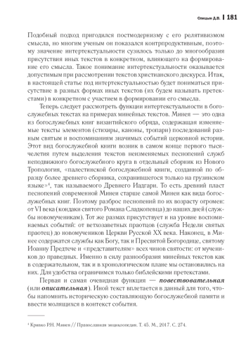 Теперь следует рассмотреть функции интертекстуальности в богослужебных текстах на примерах минейных текстов. Минея — это одна из богослужебных книг византийского обряда, содержащая изменяемые тексты элементов (стихиры, каноны, тропари) последований разным святым и воспоминаниям значимых событий церковной истории. Этот вид богослужебной книги возник в самом конце первого тысячелетия путем выделения текстов неизменяемых песнопений служб неподвижного богослужебного круга в отдельный сборник из Нового Тропология, «палестинской богослужебной книги, созданной по образцу более древнего сборника, сохранившегося только на грузинском языке»4, так называемого Древнего Иадгари.