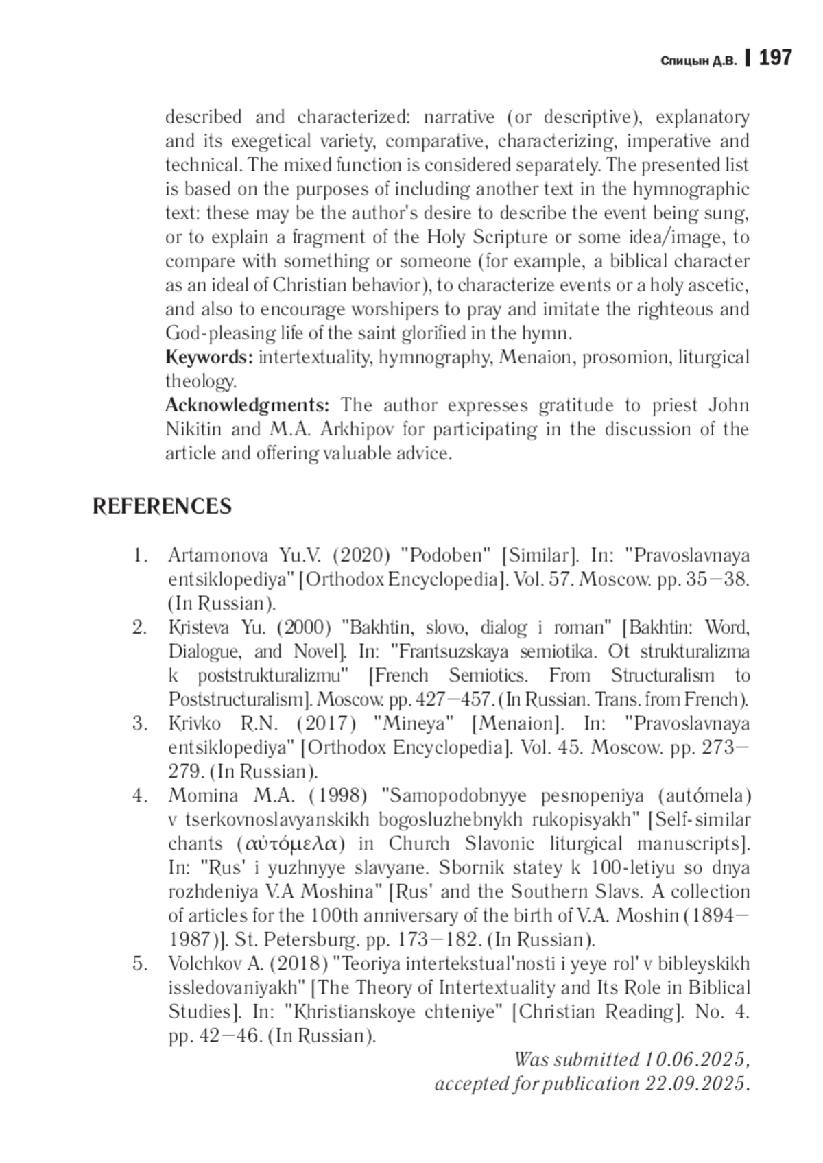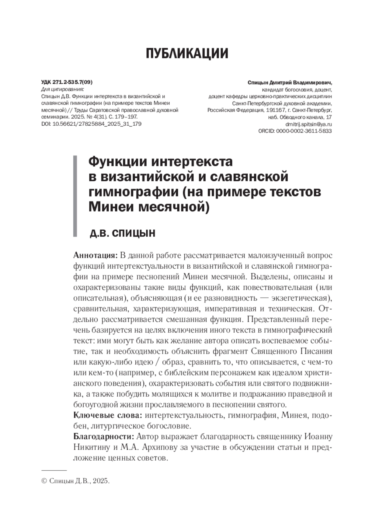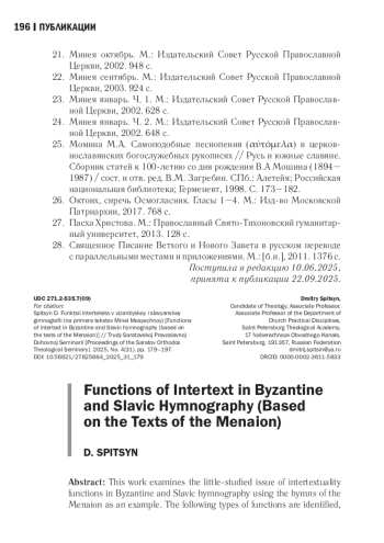 В данной работе рассматривается малоизученный вопрос функций интертекстуальности в византийской и славянской гимнографии на примере песнопений Минеи месячной. Выделены, описаны и охарактеризованы такие виды функций, как повествовательная (или описательная), объясняющая (и ее разновидность - экзегетическая), сравнительная, характеризующая, императивная и техническая. Отдельно рассматривается смешанная функция. Представленный перечень базируется на целях включения иного текста в гимнографический текст: ими могут быть как желание автора описать воспеваемое событие, так и необходимость объяснить фрагмент Священного Писания или какую-либо идею / образ, сравнить то, что описывается, с чем-то или кем-то (например, с библейским персонажем как идеалом христианского поведения), охарактеризовать события или святого подвижника, а также побудить молящихся к молитве и подражанию праведной и богоугодной жизни прославляемого в песнопении святого.