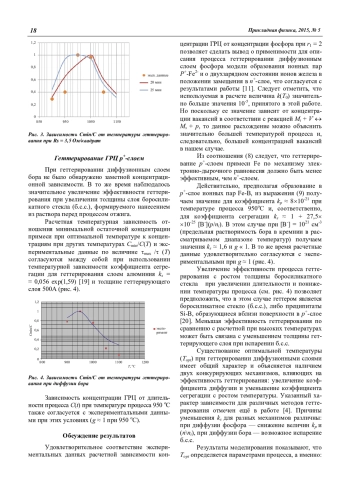 механизм образования ионных пар фосфор—железо удовлетворительно описывает закономерности процесса геттерирования диффузионным слоем фосфора от технологических параметров (температура, длительность процесса, концентрация фосфора) при условии, что железо в паре является двухзарядным акцептором; эффективность геттерирования диффузионным слоем фосфора возрастает с увеличением его концентрации в соответствии с выражением для коэффициента сегрегации ks ≈ 1 + k(T0) kp [P+] (n/ni)2;