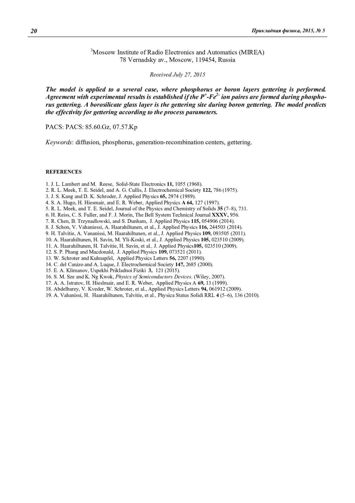 19. Vahanissi A., Haarahiltunen H., Talvitie, et al. // Physica Status Solidi RRL. 2010. V. 4. No. 5–6. Р. 136.