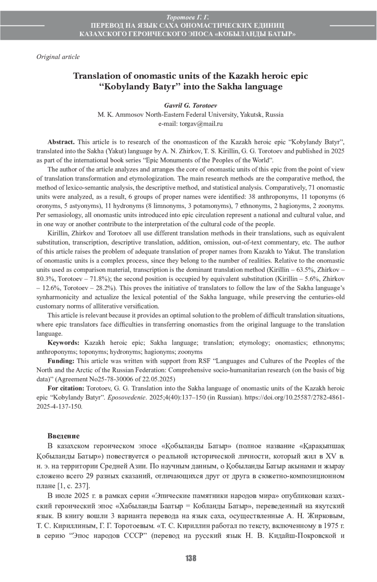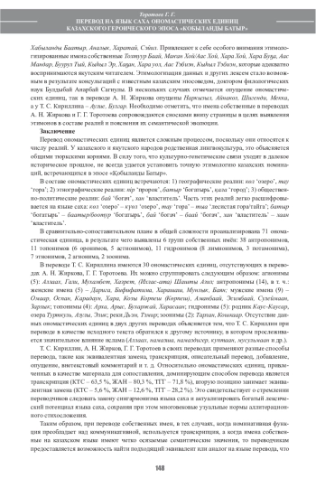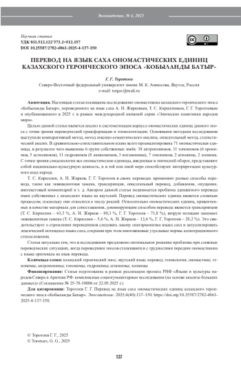 Настоящая статья посвящена исследованию ономастикона казахского героического эпоса «Кобыланды Батыр», переведенного на язык саха А. Н. Жирковым, Т. С. Кириллиным, Г. Г. Торотоевым и опубликованного в 2025 г. в рамках международной книжной серии «Эпические памятники народов мира».
