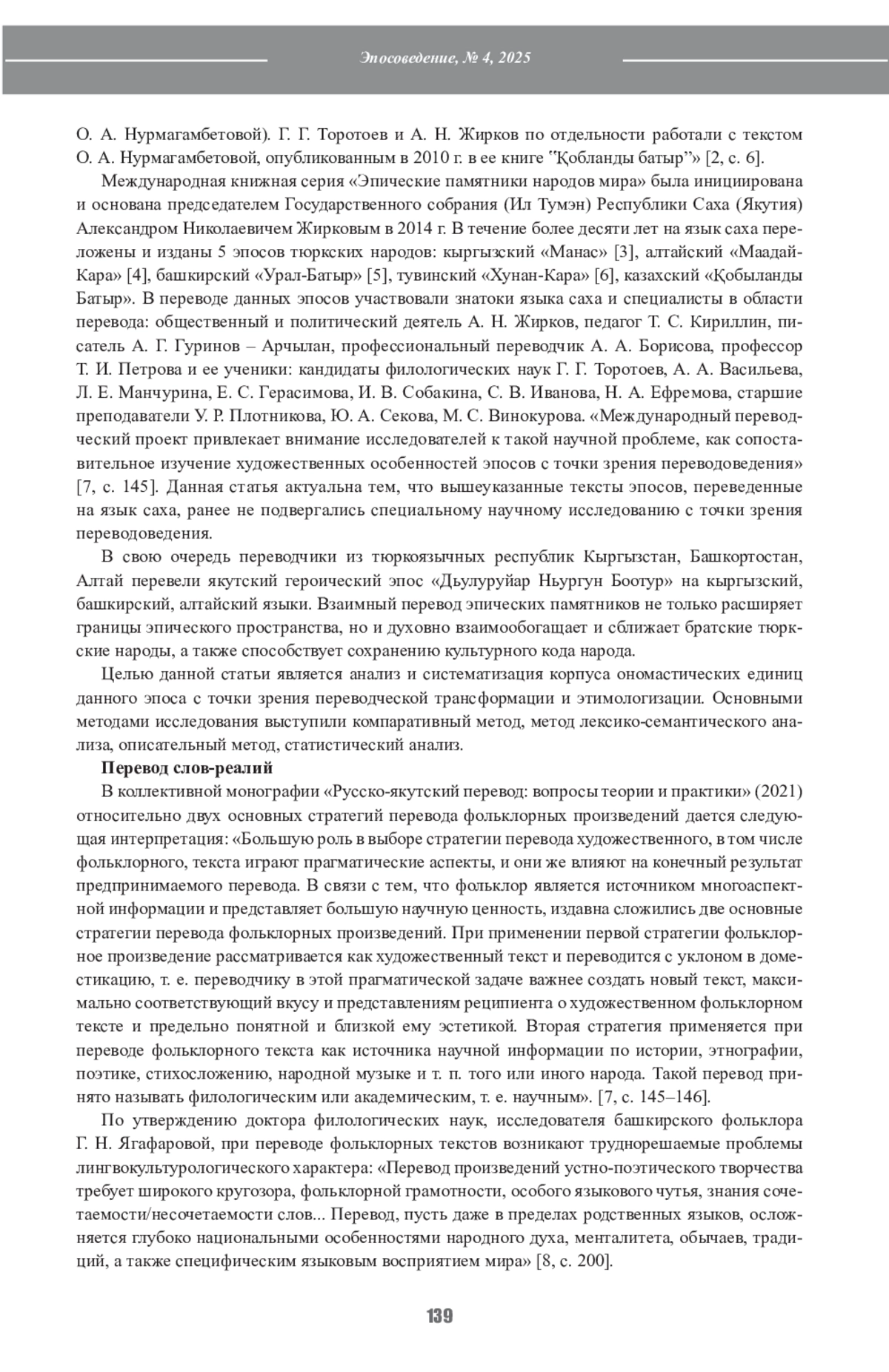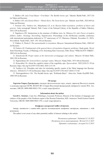 7. Торотоев Г.Г., Васильева А.А., Манчурина Л.Е. и др. Русско-якутский перевод: вопросы теории и практики: коллективная монография. Якутск: ИЦ НБ РС(Я); 2021:229.