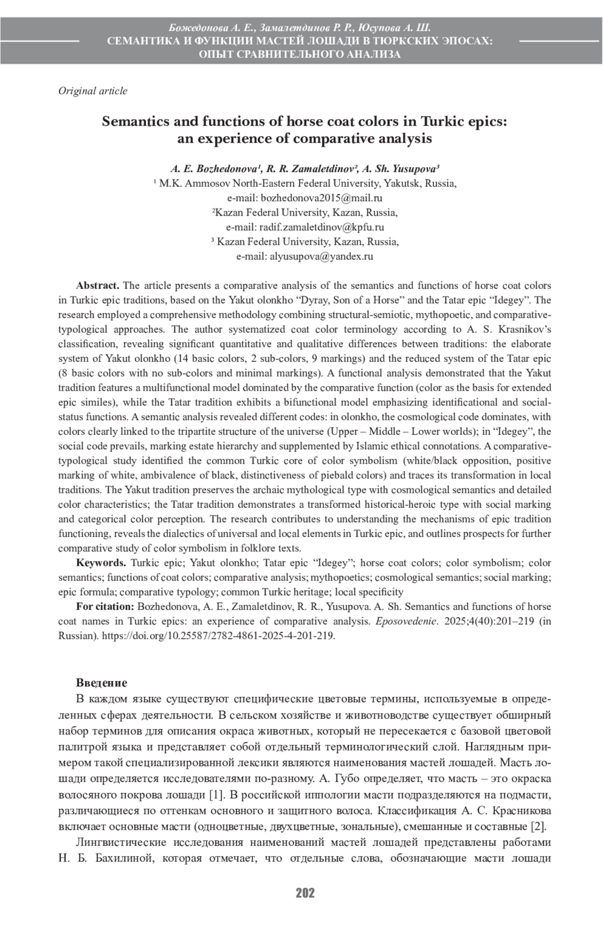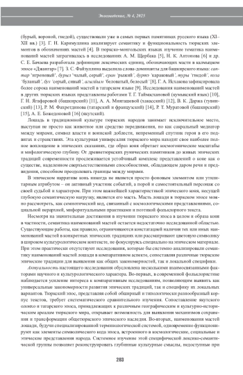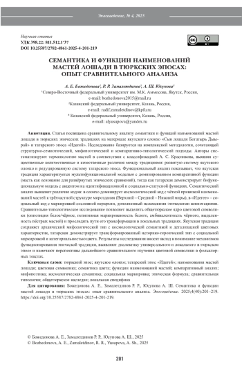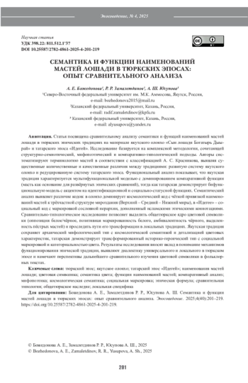 Статья посвящена сравнительному анализу семантики и функций наименований мастей лошади в тюркских эпических традициях на материале якутского олонхо «Сын лошади Богатырь Дыырай» и татарского эпоса «Идегей». Исследование базируется на комплексной методологии, сочетающей структурно-семиотический, мифопоэтический и компаративно-типологический подходы. Авторы систематизируют терминологию мастей в соответствии с классификацией А. С. Красникова, выявляя существенные количественные и качественные различия между традициями: развитую систему якутского олонхо и редуцированную систему татарского эпоса. Функциональный анализ показывает, что якутская традиция характеризуется мультифункциональной моделью с доминированием компаративной функции (масть как основание для развёрнутых эпических сравнений), тогда как татарская демонстрирует бифункциональную модель с акцентом на идентификационной и социально-статусной функциях. Семантический анализ выявляет различие кодов: в олонхо доминирует космологический код с чёткой привязкой наименований мастей к трёхчастной структуре мироздания (Верхний – Средний – Нижний миры), в «Идегее» – социальный код с маркировкой сословной иерархии, дополненный исламскими этическими коннотациями. Сравнительно-типологическое исследование позволяет выделить общетюркское ядро цветовой символики (оппозиция белое/чёрное, позитивная маркированность белого, амбивалентность чёрного, выделенность пёстрых мастей) и проследить пути его трансформации в локальных традициях. Якутская традиция сохраняет архаический мифологический тип с космологической семантикой и детализацией цветовых характеристик, татарская демонстрирует трансформированный историко-героический тип с социальной маркировкой и категориальностью цвета. Результаты исследования вносят вклад в понимание механизмов функционирования эпической традиции, выявляют диалектику универсального и локального в тюркском эпосе и намечают перспективы дальнейшего сравнительного изучения цветовой символики в фольклорных текстах.