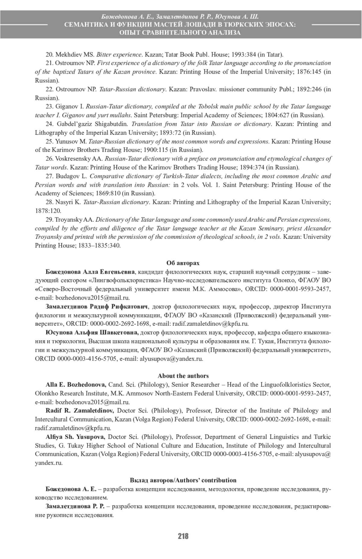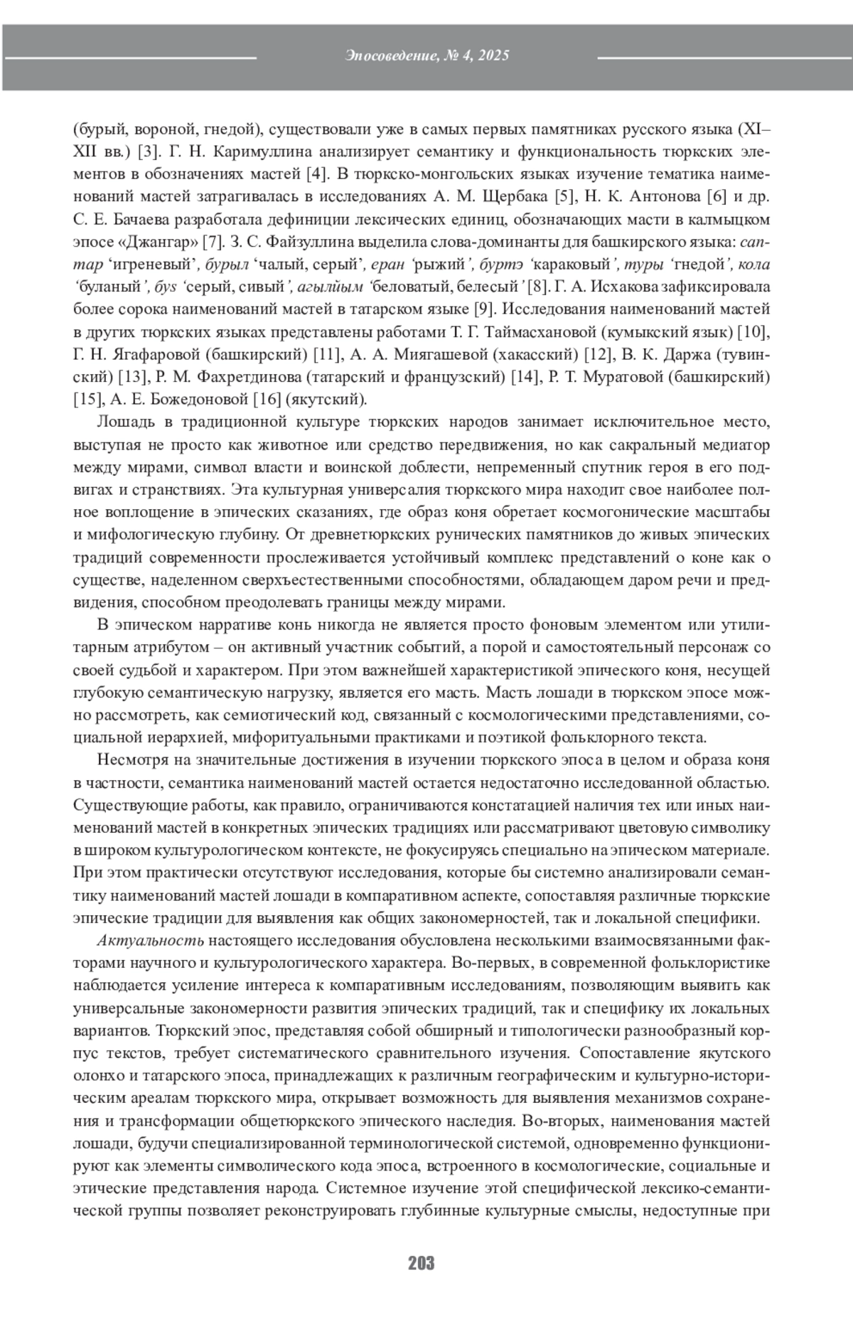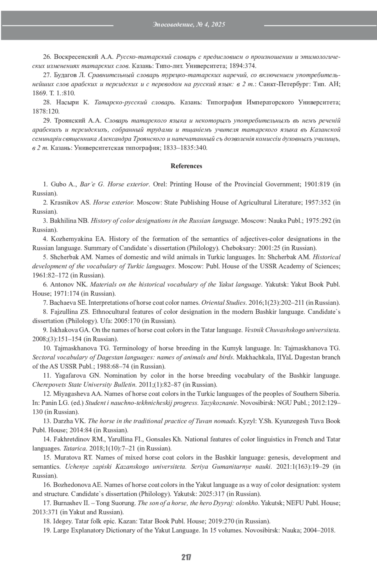 15. Муратова Р.Т. Названия смешанных мастей лошади в башкирском языке: генезис, развитие и семантика. Ученые записки Казанского университета. Серия: Гуманитарные науки. 2021;163(1):19-29.