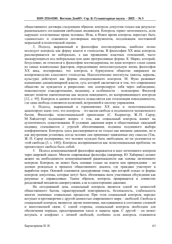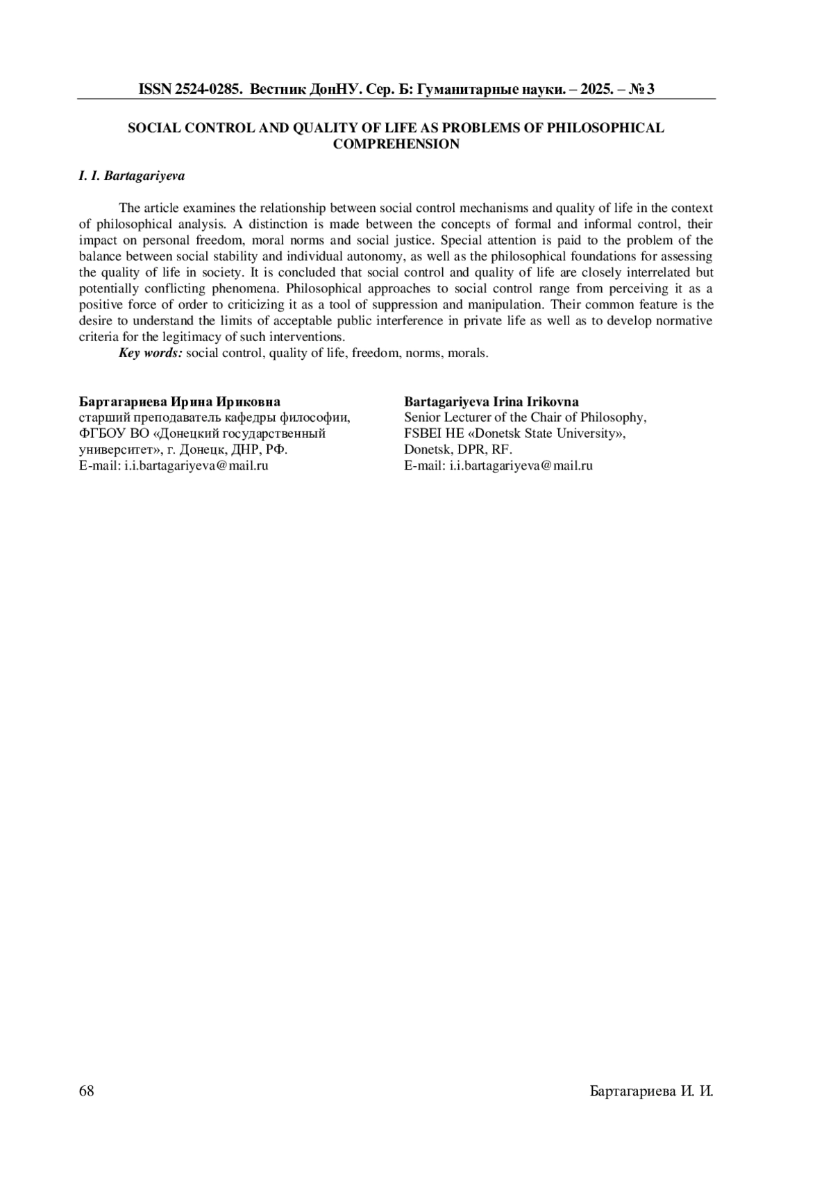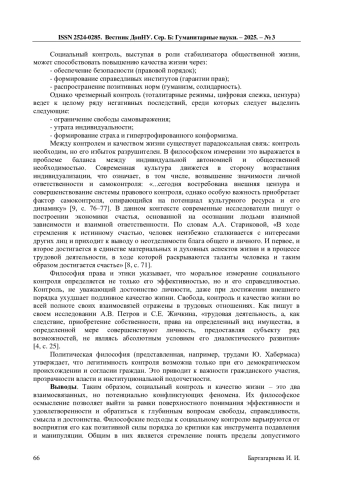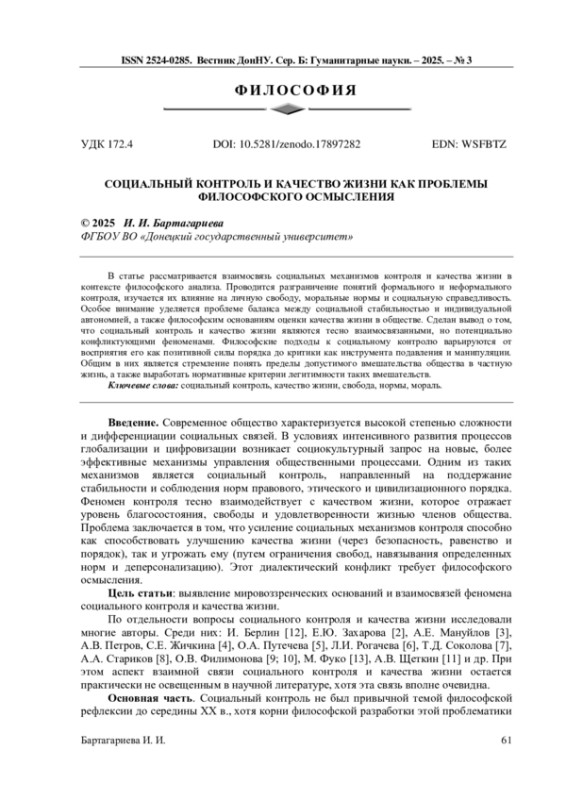 В статье рассматривается взаимосвязь социальных механизмов контроля и качества жизни в контексте философского анализа. Проводится разграничение понятий формального и неформального контроля, изучается их влияние на личную свободу, моральные нормы и социальную справедливость. Особое внимание уделяется проблеме баланса между социальной стабильностью и индивидуальной автономией, а также философским основаниям оценки качества жизни в обществе. Сделан вывод о том, что социальный контроль и качество жизни являются тесно взаимосвязанными, но потенциально конфликтующими феноменами. Философские подходы к социальному контролю варьируются от восприятия его как позитивной силы порядка до критики как инструмента подавления и манипуляции. Общим в них является стремление понять пределы допустимого вмешательства общества в частную жизнь, а также выработать нормативные критерии легитимности таких вмешательств.
