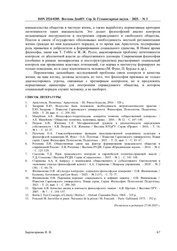 9. Филимонова О.В. “Культура контроля”: социально-философское измерение / О.В. Филимонова // Economy, Governance and Law Basis. - 2023. - № 2 (37). - С. 72-77.