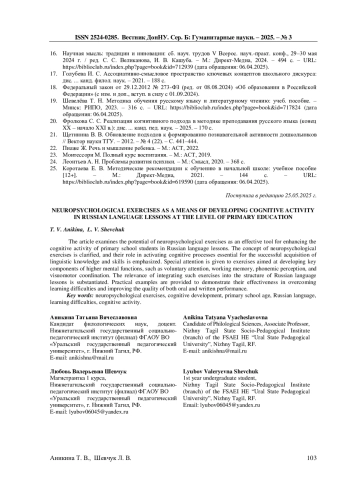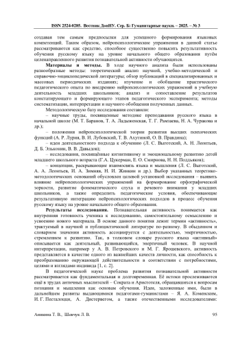 В статье анализируется потенциал нейропсихологических упражнений как эффективного средства стимулирования познавательной активности младших школьников на уроках русского языка. Уточняется понятие нейропсихологических упражнений, подчеркивается их значение для активации когнитивных процессов, обеспечивающих успешное усвоение языковых знаний и умений. Особое внимание уделяется упражнениям, направленным на развитие таких компонентов высших психических функций, как произвольное внимание, операциональная память, фонематическое восприятие и зрительно-моторная координация. Обосновывается целесообразность их интеграции в структуру уроков русского языка. Приводятся практические примеры упражнений, доказавших свою эффективность в преодолении учебных трудностей и повышении качества выполнения как устных, так и письменных заданий учащимися.