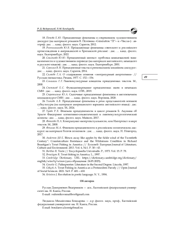 18. Попова Е. Ю. Прецедентные феномены в современном художественном дискурсе (на материале романов В. Пелевина “Generation “П” и “Числа”): автореф. дис. … канд. филол. наук. Саратов, 2012. EDN: ZOMMLZ