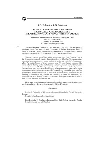 Выявляются основные функции, реализуемые прецедентными именами в романе американского писателя-постмодерниста Ричарда Бротигана «Trout Fishing in America». В исследовании применялись методы контекстуального и интертекстуального анализа, а также метод сплошной выборки. Выявленная выборка литературных прецедентных имен (61 единица) представлена прецедентными библионимами (названия литературных произведений), анхистонимами (фамилии авторов) и антропоэтонимами (имена персонажей). Установлены следующие ключевые функции прецедентных имен в романе Р. Бротигана: людическая (реализация комического эффекта), поэтическая (повышение художественной значимости текста и создание тропеических отношений), характеризующая (описание личности героев), референтная (воссоздание культурно-исторического контекста эпохи) и текстообразующая (формирование сюжетной канвы и структурирование внутритекстовых связей). Показано, что прецедентные имена в тексте произведения обладают полифункциональным характером, при этом в качестве гиперфункции выступает людическая функция.